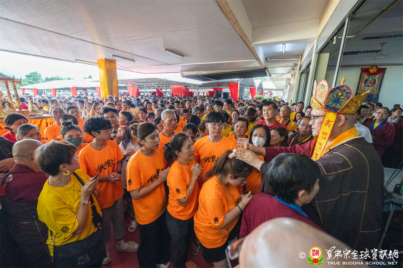 法會主壇上師蓮東上師開示時,首先感謝根本傳承上師慈悲特許其代師傳授「聖觀音第一富豪法」,及為與會大眾做賜福與傳法灌頂。上師相信由諸位長老及上師在「教育實體研習班」中所分享的佛學知識及修法口訣心要,必讓所有學員收獲滿滿。上師再恭賀所有獲得獎章的僧伽及居士弘法人員之際,也不忘感謝所有一直以來為宗派道場默默付出的弘法人員、同門及義工。上師指出:「此次為期一個星期的系列教育與法會活動,仰賴所有人的付出。有錢出錢、有力出力。無論是財布施、法佈施或無畏布施,都是在發菩提心,與聖觀音一樣慈悲喜捨、四無量心。」有了諸位同門及善信大德的發心付出,體現諸佛菩薩無緣大慈、同體大悲的精神,方有促使法會圓滿進行的因緣。義工團隊的發心付出與服務,體現了諸佛菩薩的慈悲精神。