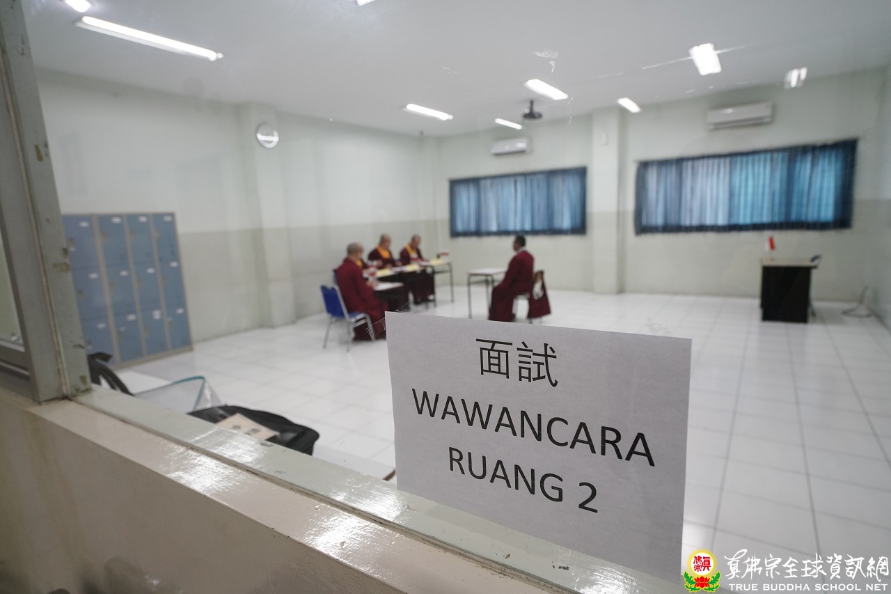 6月26日上午是筆試,講師助教在同一間考場作答,當然試卷不同。下午的面試及梵唄,則在敬德學校的教室舉行。一共借用了6間高中生的教室作為考場,其中一間是考生等待室,兩間作為梵唄考場,三間用來面試,每間考場有三位上師。考講師的先接受面試,考助教的五人一組先考梵唄。考試期間嚴禁交談,大家都能遵守規則。這場考試一直進行到下午五點才全部結束。晚餐後宗委會上師們和密總,總協,及印尼上師召開一次工作會議,直到晚上九點半過後,才回去休息。
