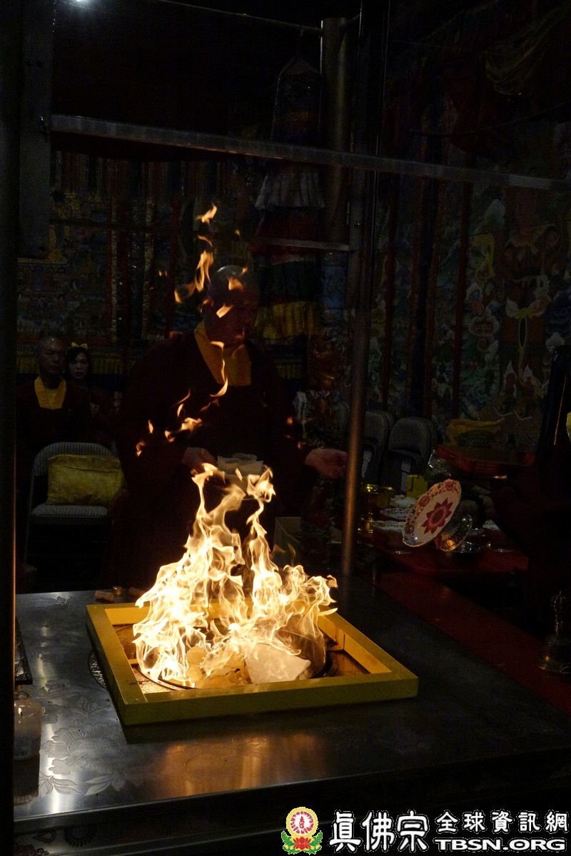 下午二點三十分,釋迦摩尼佛大法會正式拉開序幕,師尊點燃護摩火,頓時熊熊火焰沖天,咒音攝人心魄,與會大眾齊誦「釋迦摩尼佛心咒」,手結「釋迦摩尼佛手印」,覌想在烈焰中與釋迦摩尼佛、火天神合一,進入火光三昧。師尊在火光中演化息災、增益、敬愛、超度大手印,在陣陣法流的加持下,祈望能夠除一切的業障,煩惱。
