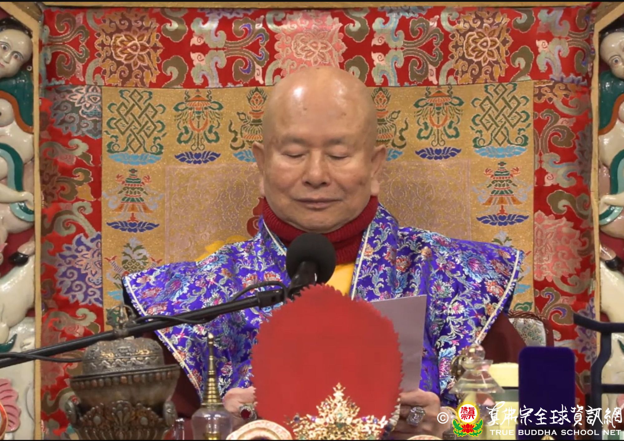 聖尊解釋經義:在那個時間裡面,「寶蓋」跟所有的眷屬一起供養「藥王如來」五個劫。過了這個五劫祂告訴祂的一千位孩子,你們這一千個小孩都要像我一樣,用最志誠的心去供養「藥王如來」。於是這一千位孩子收到了父親的命令,一起供養「藥王如來」,一切都按照「寶蓋」的命令,一切都很好。
