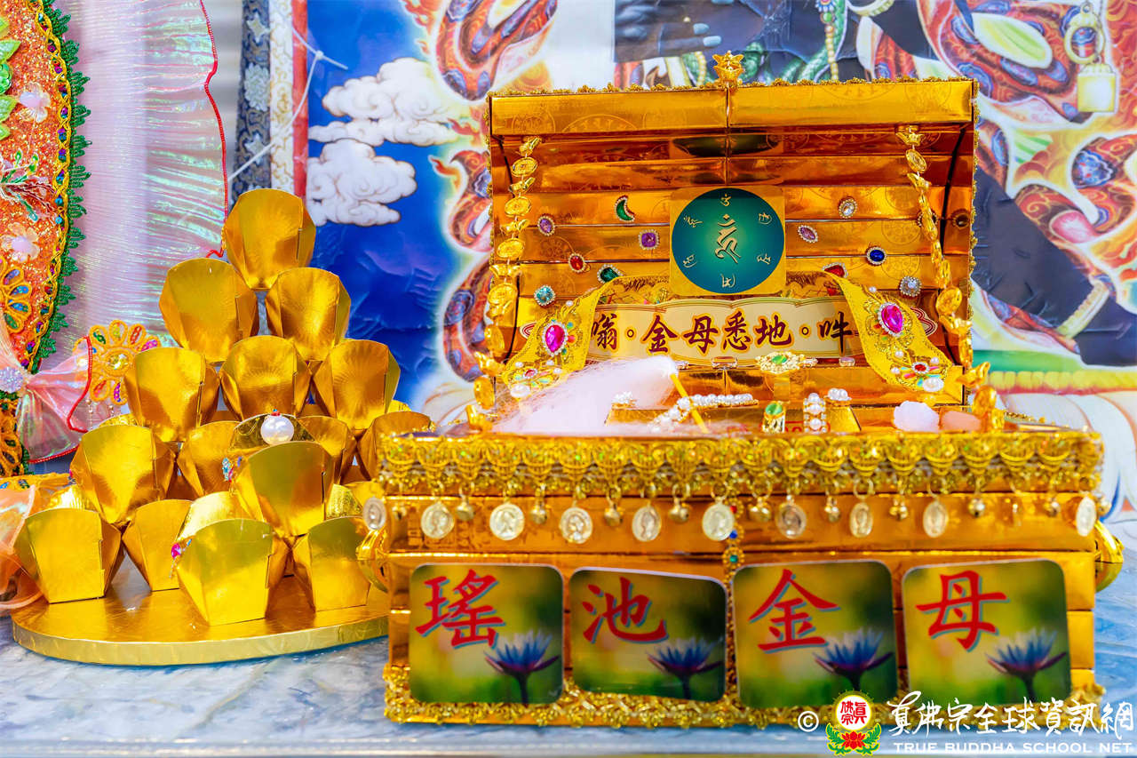 今天的護摩主尊是瑤池金母。沒有瑤池金母,就沒有盧師尊,沒有盧師尊,就沒有真佛宗。在護摩壇的這一尊瑤池金母的唐卡跟供在前面的瑤池金母是天女型的瑤池金母,祂的眼神非常的慈悲。我們真佛宗的瑤池金母是天女型的,是最美麗最年輕的,這是我們True Buddha School的特色。