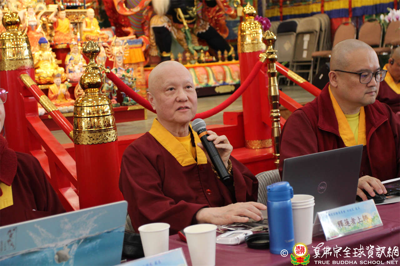教育處 處長釋蓮訶上師報告,教育是一項需要長期推動的工程,從兒童教材開始紮根、中小學教材,到一般弟子的近程、中程、長程教育計畫,都在蓮訶上師帶領的教育團隊集思廣益,整個架構內容已然清晰可見。2025的課程有蓮萊上師、蓮碤上師講授《真佛密法二》,以及「精進提升年」打卡功課,更全面性的包含修法類、修心類、進修類的打卡。透過推動「千江有水千江月方案」,希望世界各地真佛道場成為學習佛法的教育中心。另外對於現行熱門的人工智慧,也將著手招募師資為大眾授課。