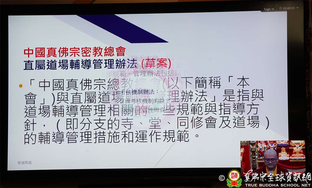 財政處 處長釋蓮者上師報告,宗委會於世界各地的財政收支狀況,同時也感謝馬密總、印尼密總協、台密總、台灣雷藏寺等全力協助宗委會的財政收支。對於師尊賜福給宗委會所推出的贊助方案,如「新春接財神吉祥物」、「哥就是莊嚴福慧袋」…等,請諸位上師多多支持,並幫忙做宣傳。