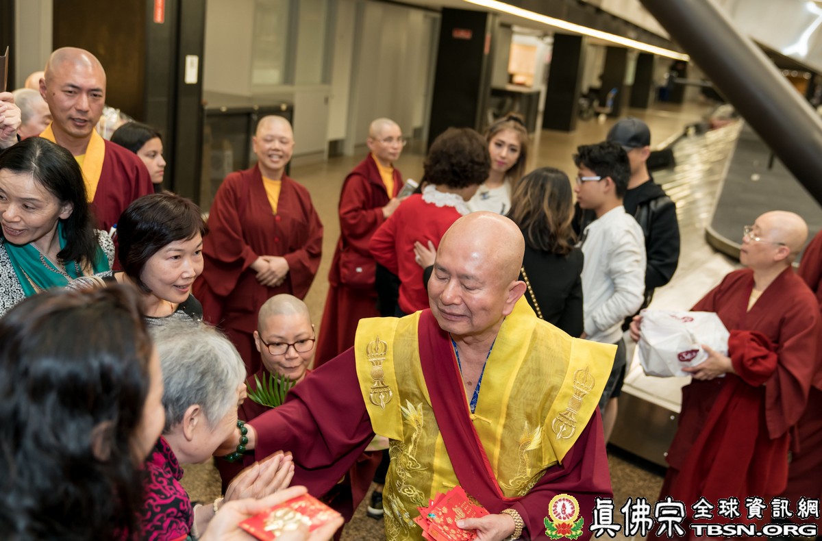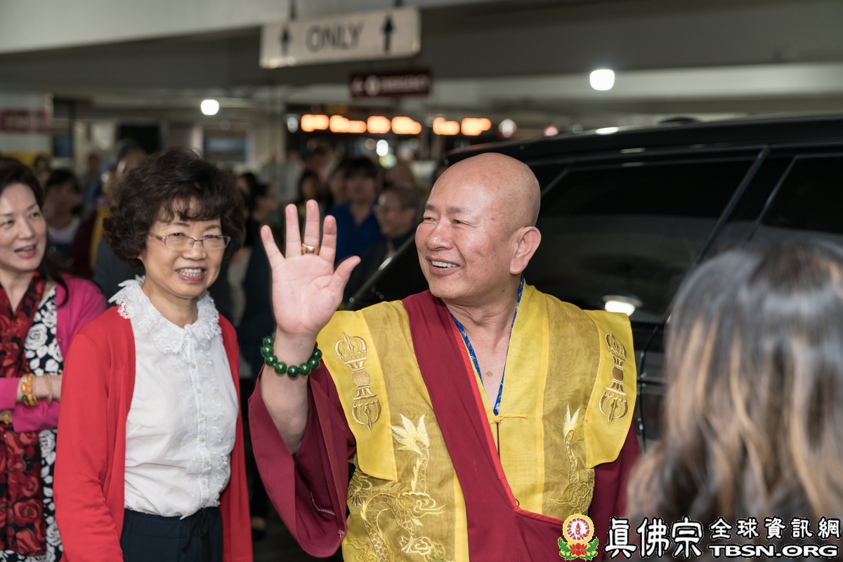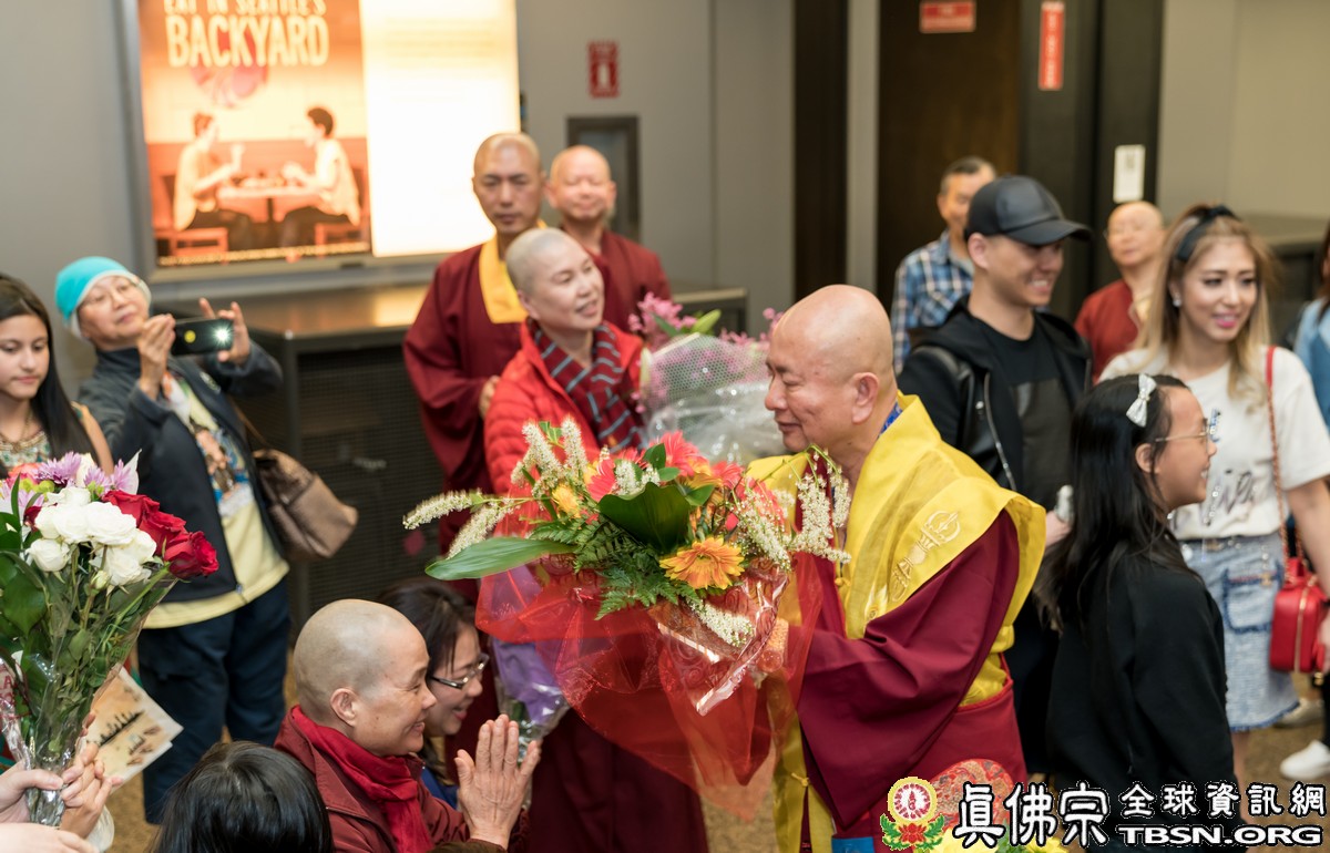 當師尊、師母出現的那一剎,激動的心、熱烈的掌聲,感覺血是沸騰的,心是高漲的。師尊、師母那熟悉的慈愛笑容、親切的問候,讓大家久久感動不已。廖東周大使伉儷,也聯袂特地從加州趕到西雅圖機場來迎接師尊、師母,西雅圖中國城的麥顯輝師父也親自領了醒獅隊,在機場敲鑼打鼓、舞動雄獅。許多機場的旅客都駐足觀望,甚至拿手機拍照錄影,有幸見聞這親切熱鬧的場面。