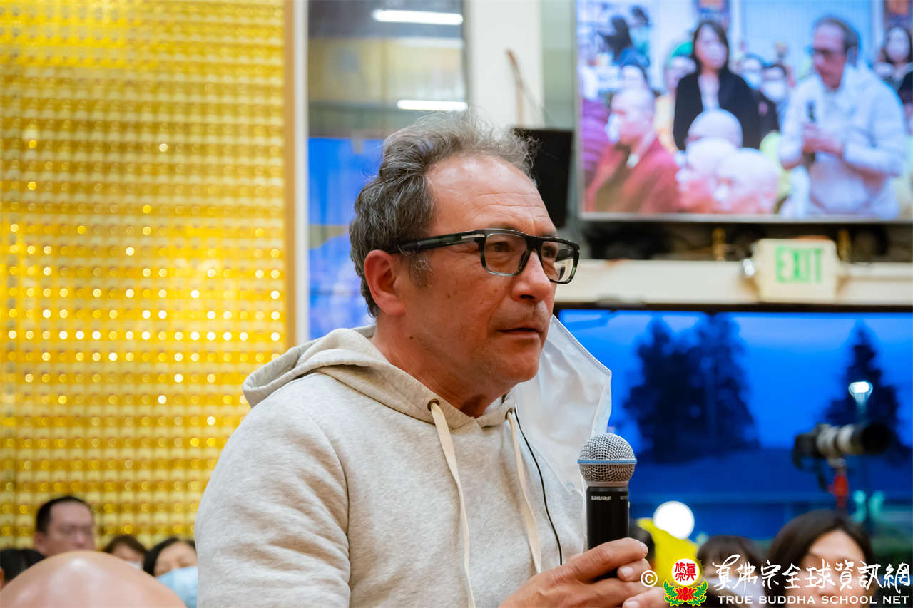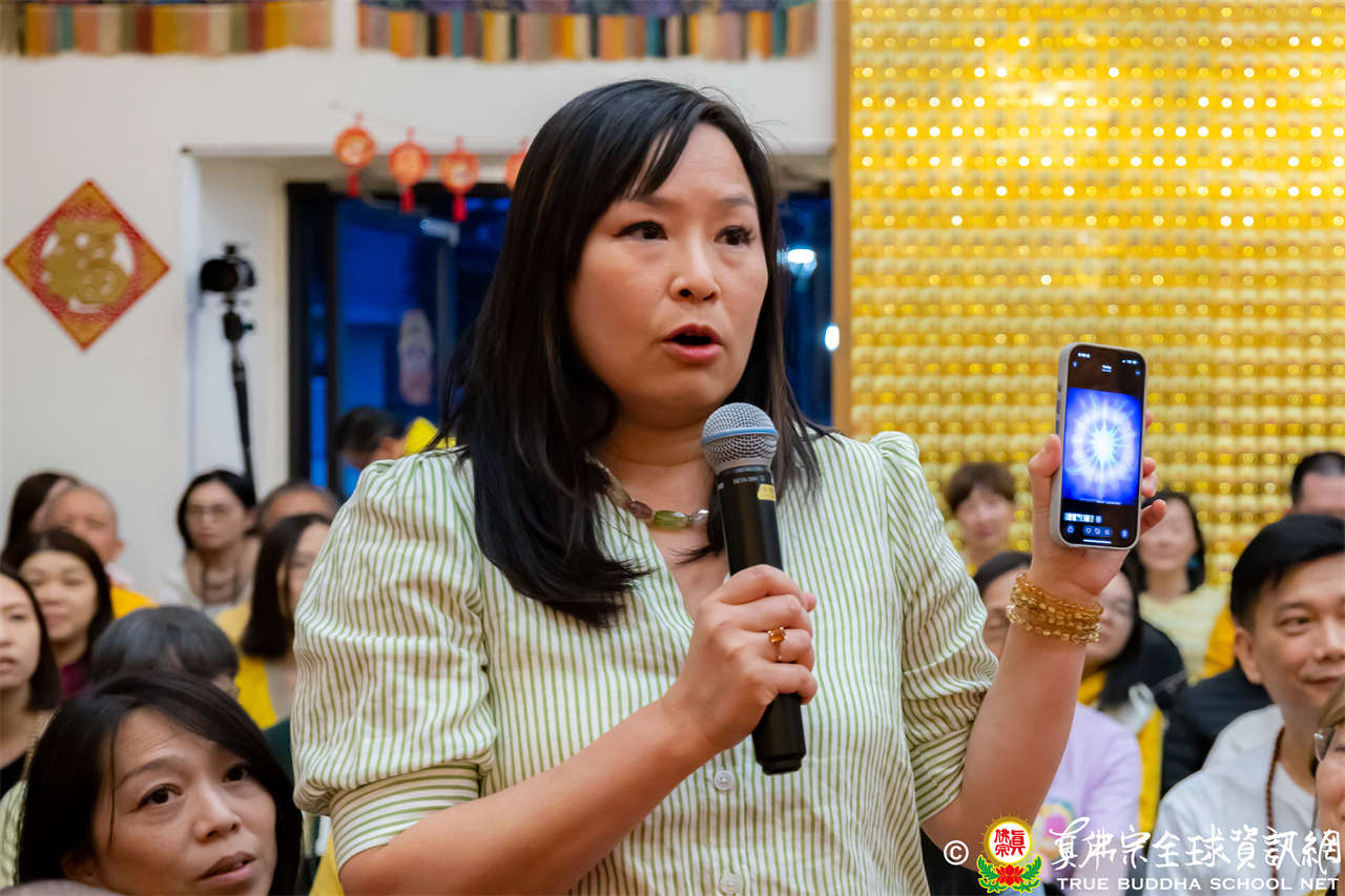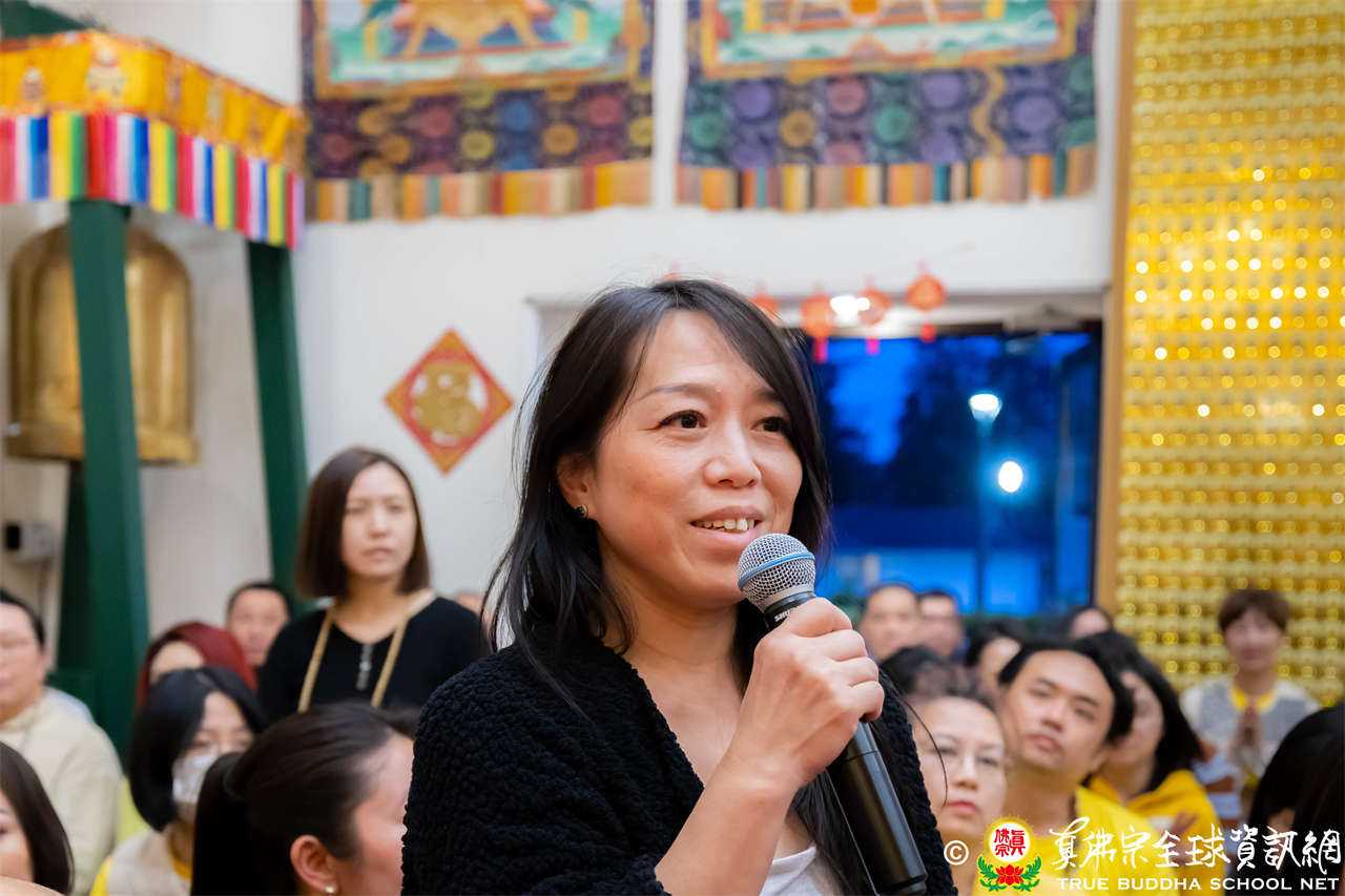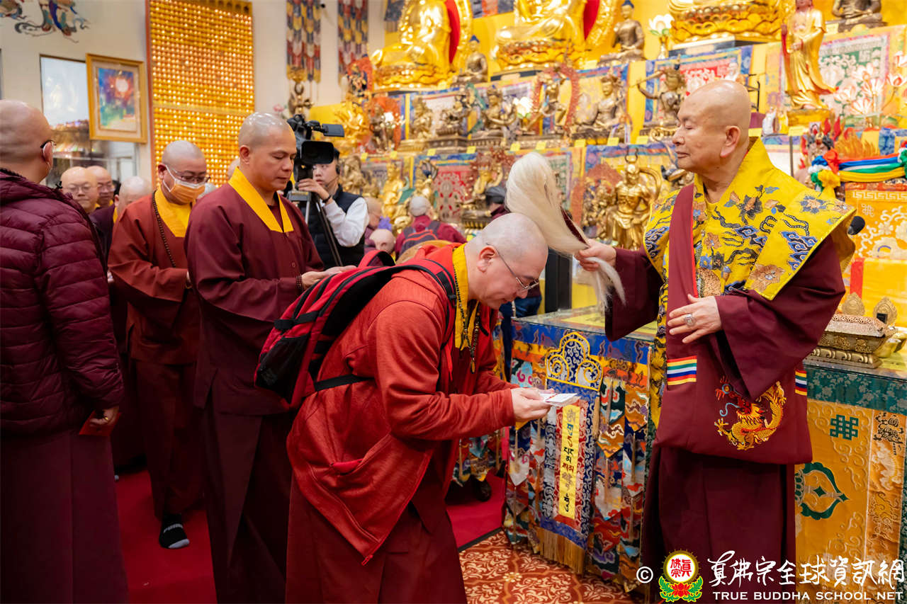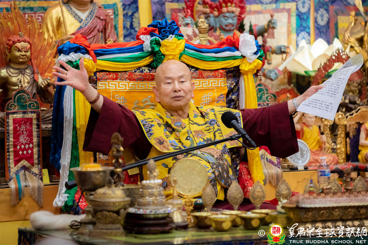 聖尊精闢寶貴的法語開示後,慈悲為新皈依弟子做皈依灌頂,然後加持大悲咒水,開光佛像,最後持佛麈一一加持與會大眾。