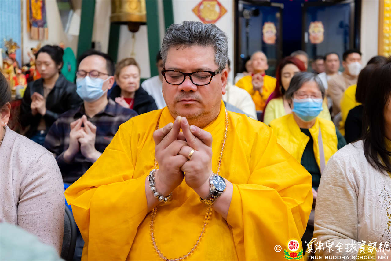 2025年4月19日晚上八時,美國西雅圖雷藏寺大雄寶殿裡,蓮生活佛盧勝彥帶領來自世界各地的四衆弟子,同修準提佛母本尊法並講授《大佛頂首楞嚴經》。