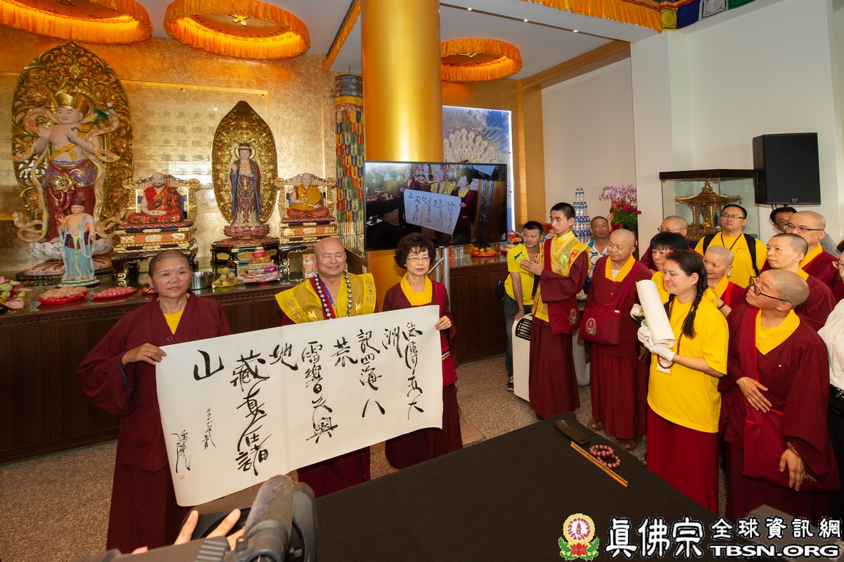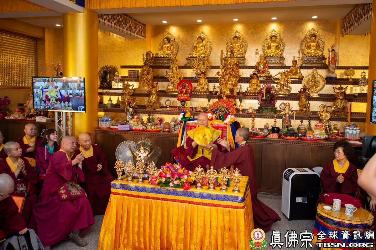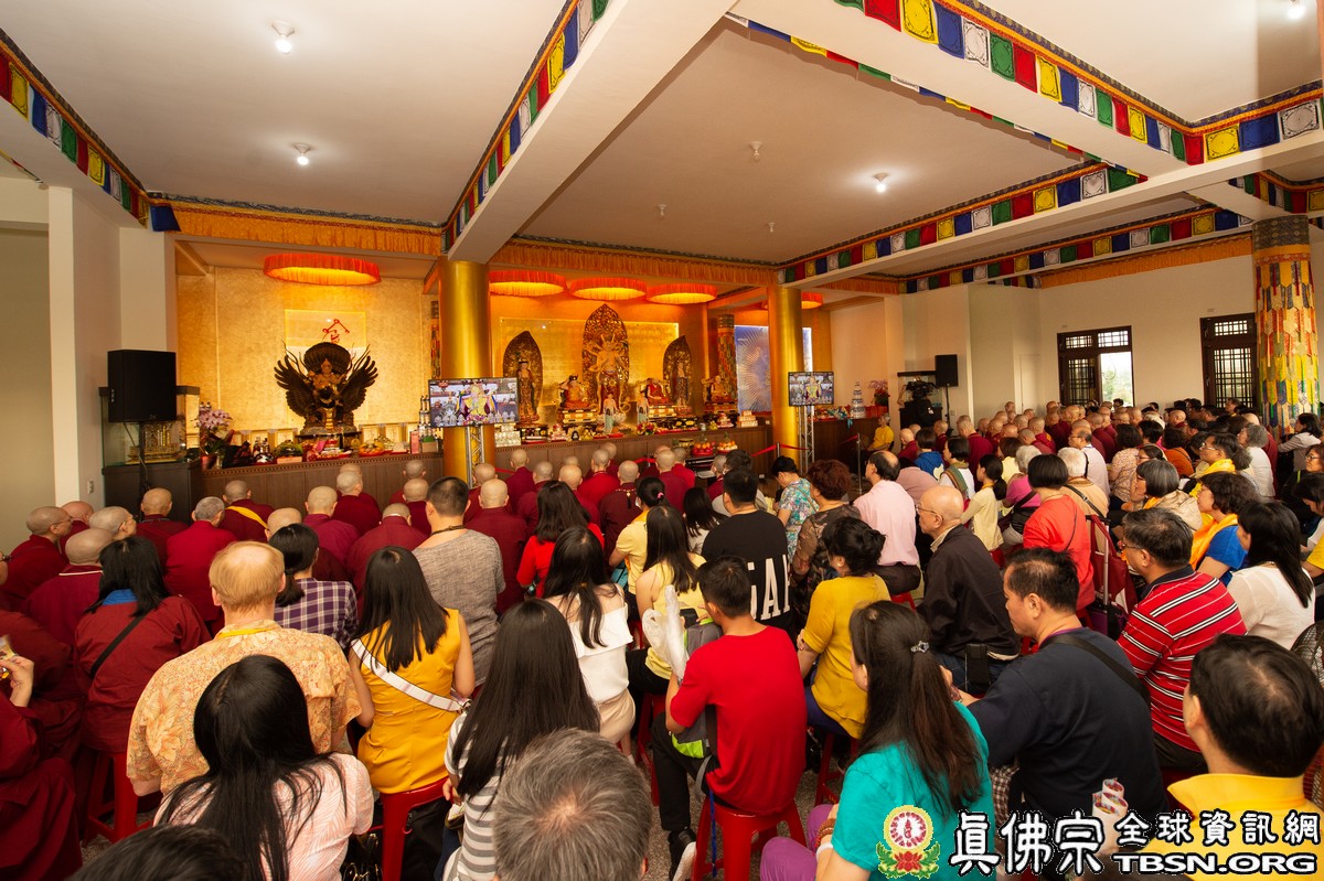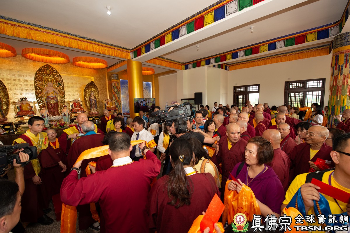 法王到達法記雷藏寺後,即為雷藏寺主持剪綵典禮及作灑淨結界,賜墨寶和慈悲接受600多位主祈者敬獻哈達,並替法記雷藏寺壇城開光。
