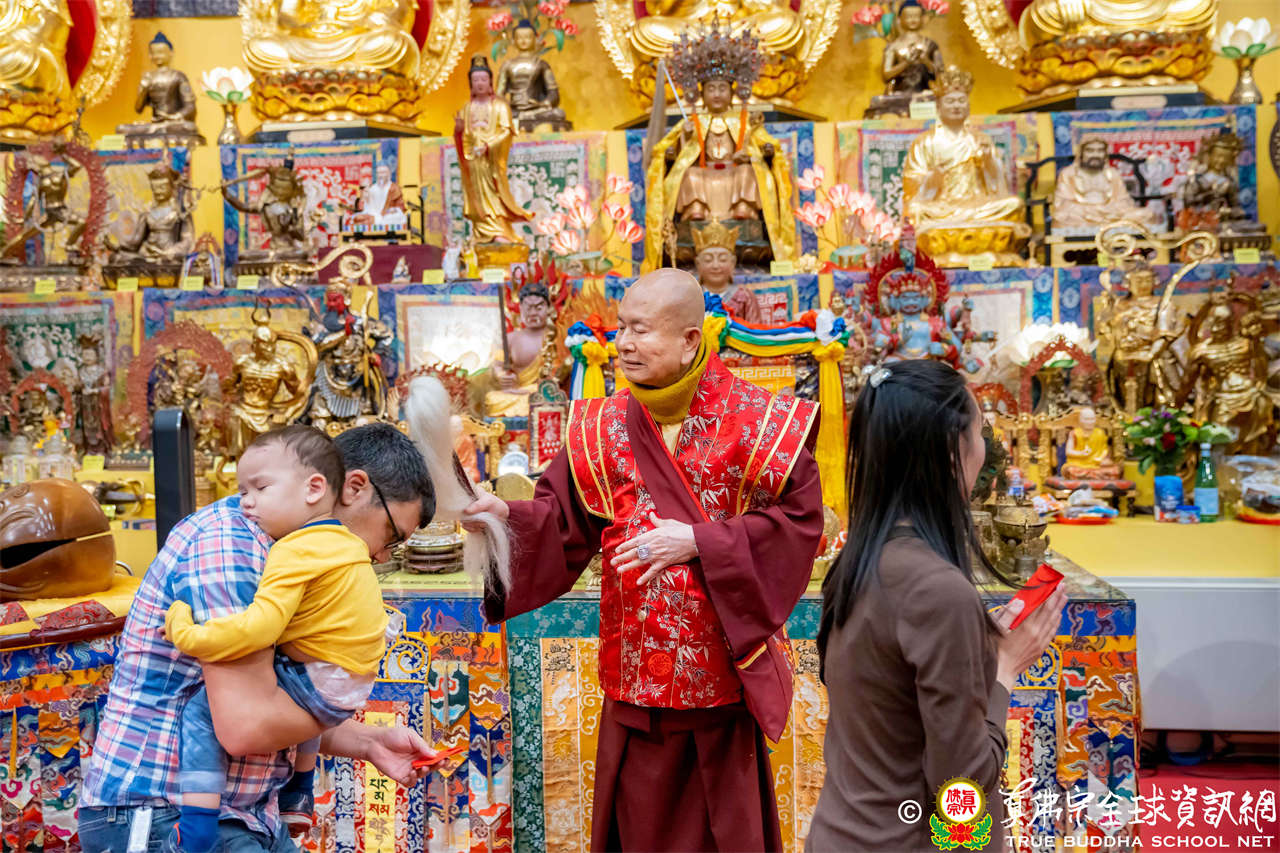 在殊勝珍貴的法語開示之後,聖尊為新皈依者進行皈依灌頂,並開光佛像、加持大悲咒水、持拂塵加持與會大眾。感念聖尊慈悲不捨眾生,弘法度眾不辭辛勞,日日年年如此,祈願聖尊佛體康泰,吉祥如意,弟子眾等惕勵精進,自度度他,六度齊修,以圓成菩提。