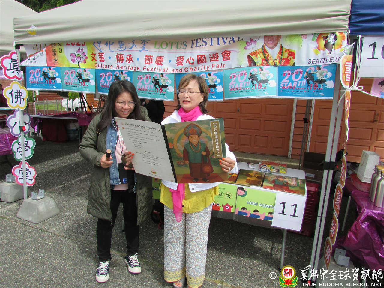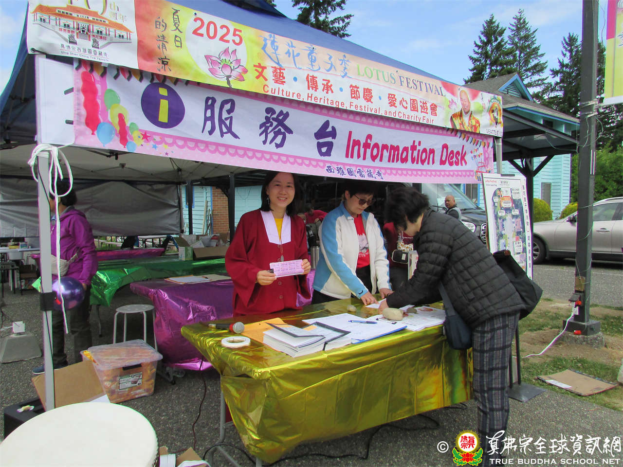 園遊會入口處設有服務台,莲花佩芬助教與蓮花曉芳師姐親切的為遊客解答問題,並提供園遊券的兌換服務。