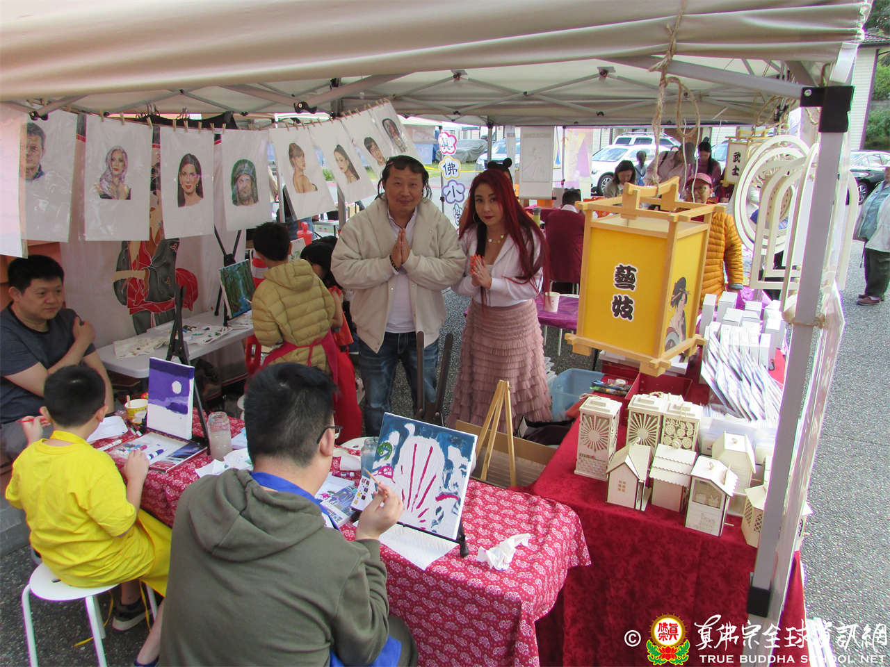 其中有一幅是大日中蓮花盛開的圖畫,聖尊題字為「夏日的清涼」,正好應了今天的天氣。因為之前好幾天都是非常酷熱,但今天天氣突然非常涼爽,約攝氏15度到20度之間,清風拂面,非常適宜遊客在露天的帳棚前參與活動。