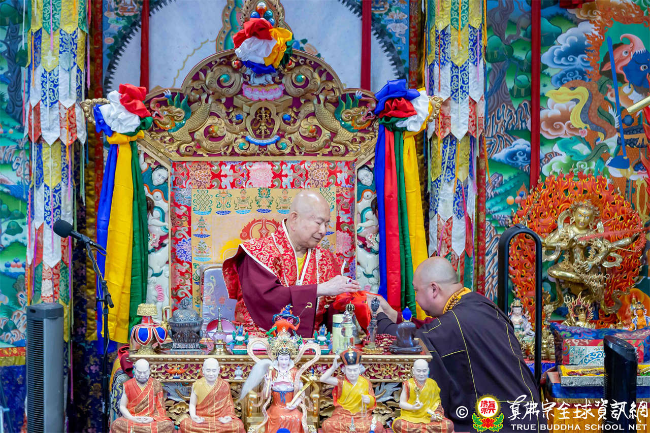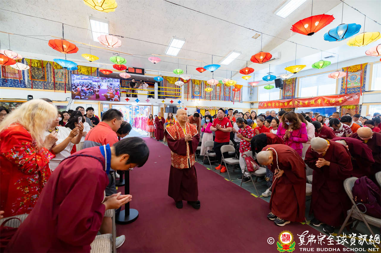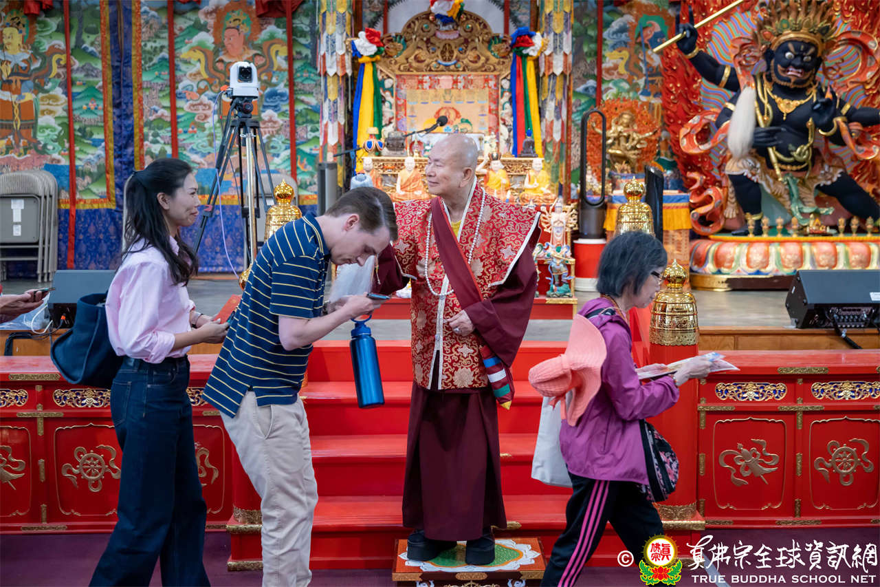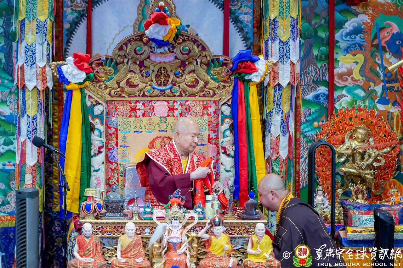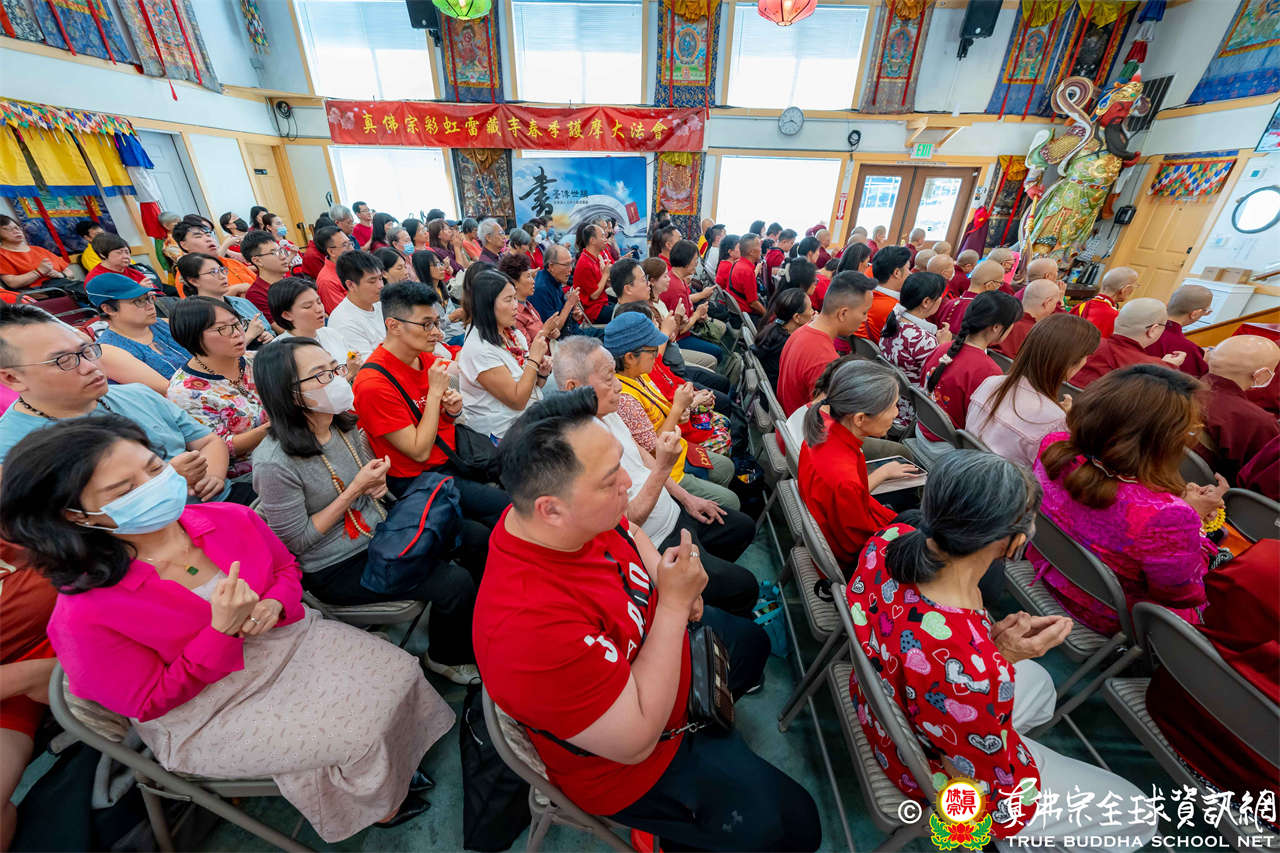 法王開示畢,衆人報以熱烈掌聲感謝。接著法王下座與綫上弟子互相問候,並為與會大衆賜授勾財天女法灌頂。法會至此圓滿結束。