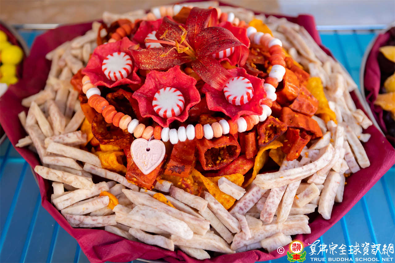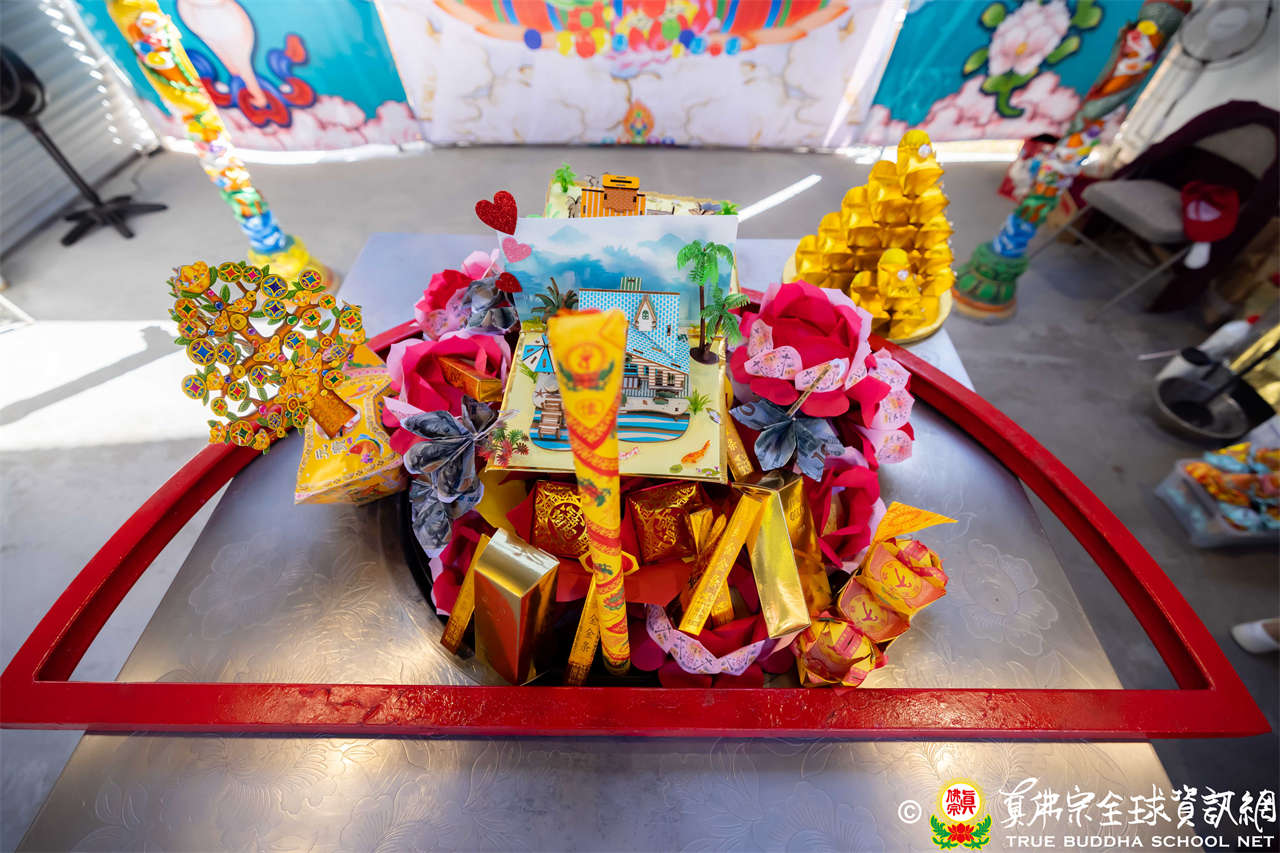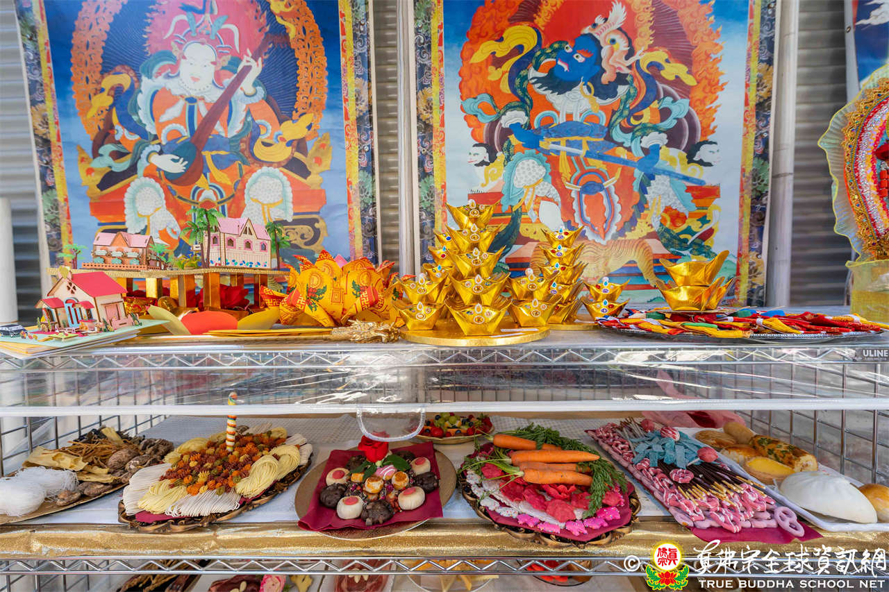 接著法王介紹此次法會主尊勾財天女,就是「勾攝財續母」,是阿彌陀佛心中所化,是西方極樂世界的財神。西方極樂世界的八功德水、七寶蓮池、黃金宮殿、七寶羅閣、七重欄楯、七重羅網、七重行樹,都是勾財天女引進來的。