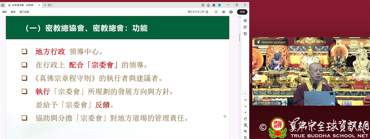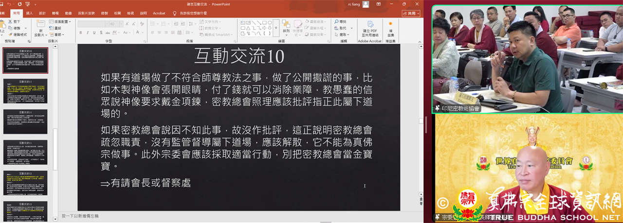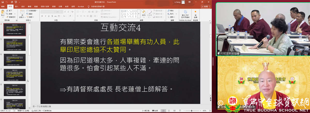 在互動交流環節中,來自印尼各道場的提問非常踴躍,內容涵蓋多元。宗委會各處長皆悉心回應,並將問答紀錄集結以中印雙語資料供全體道場參考,詳細內容請參閱真佛宗務網站\宗派資訊\公告,連結如下: https://truebuddhaschool.org/site/latestinfo?ref=AC_EJ3IOZ