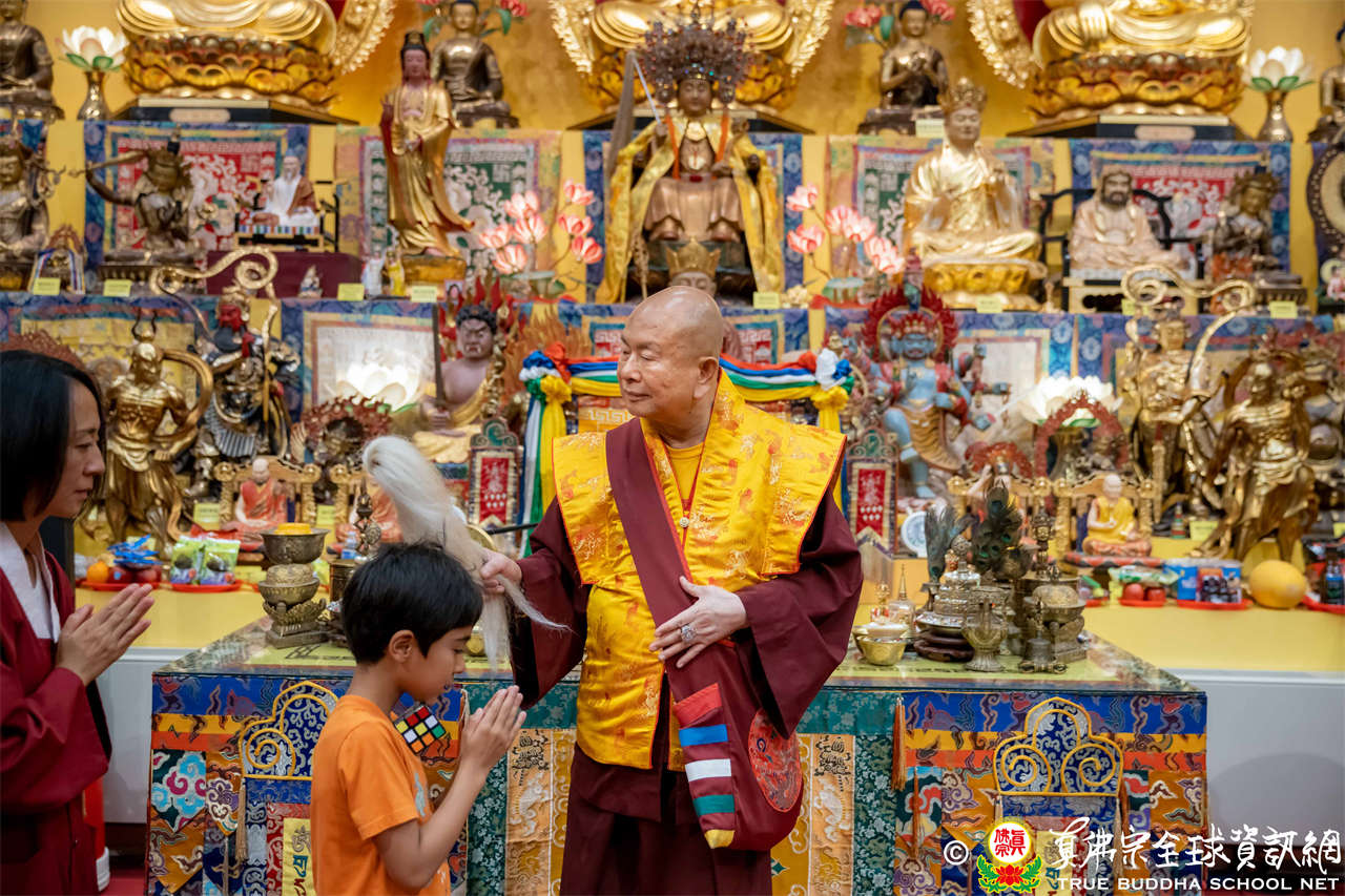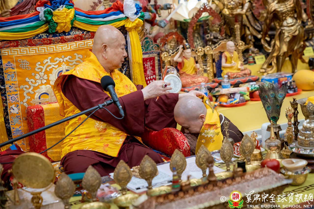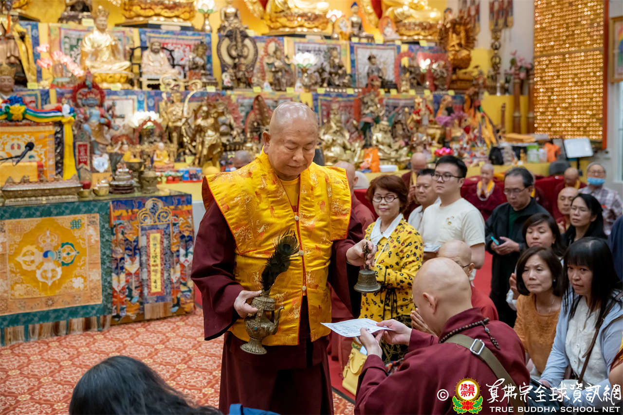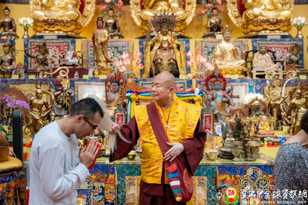 聖尊精彩絕倫的開示結束後,為新皈依者慈悲賜授皈依灌頂,加持大悲咒水,加持佛具部,開光佛像,並且為與會大眾以拂塵摩頂加持。