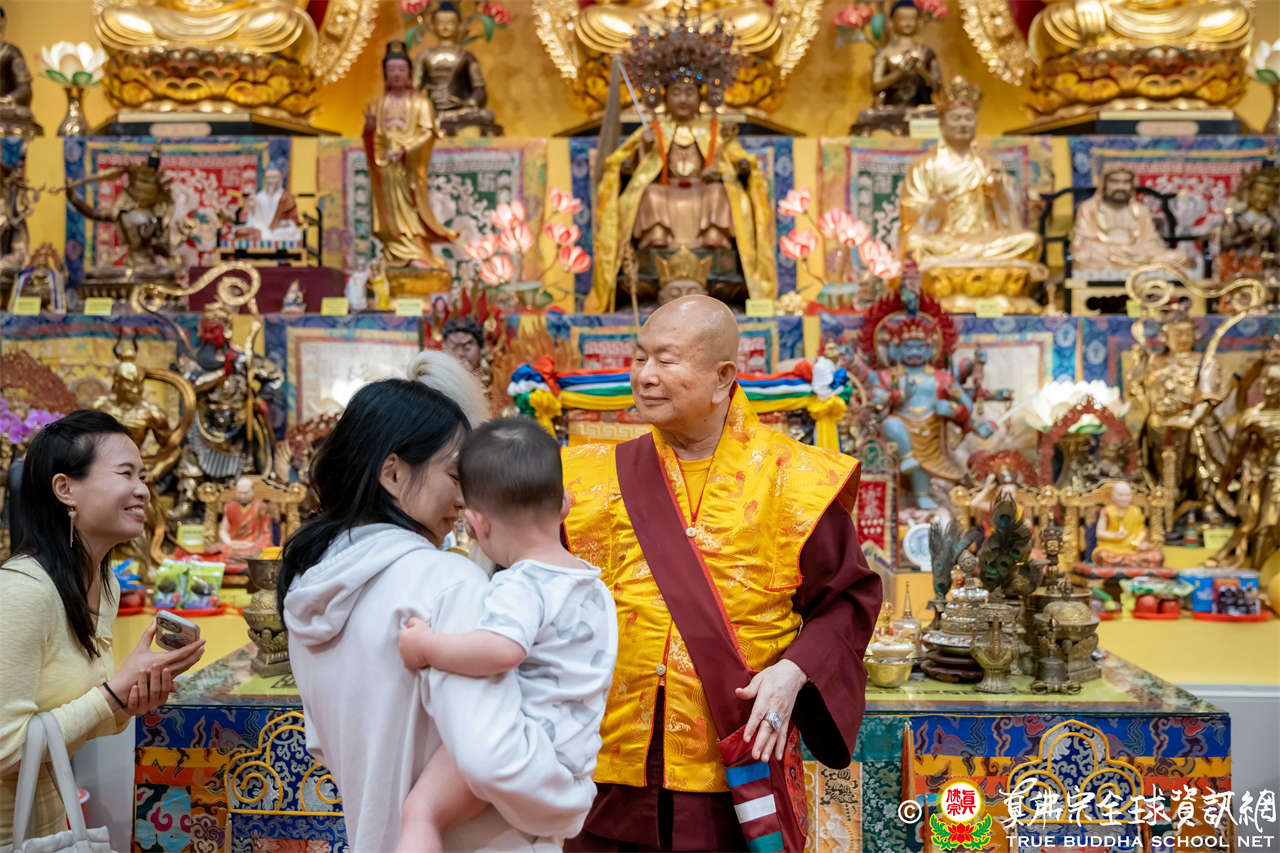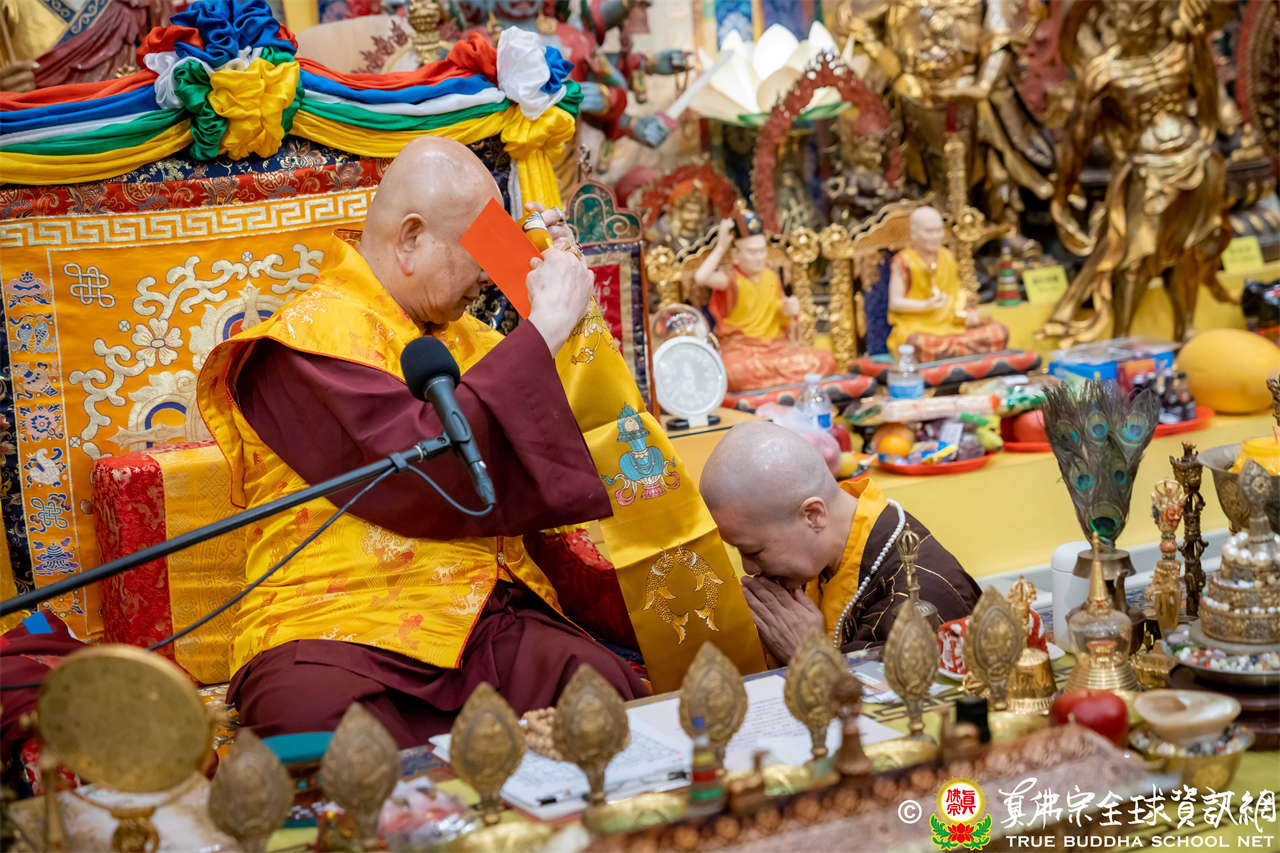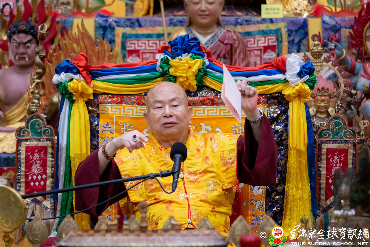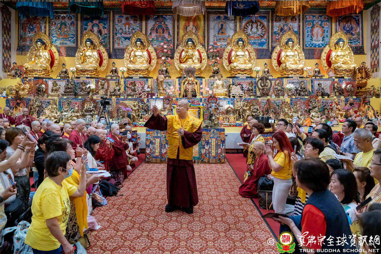 聖尊精彩絕倫的開示結束後,為新皈依者慈悲賜授皈依灌頂,加持大悲咒水,加持佛具部,開光佛像,並且為與會大眾以拂塵摩頂加持。