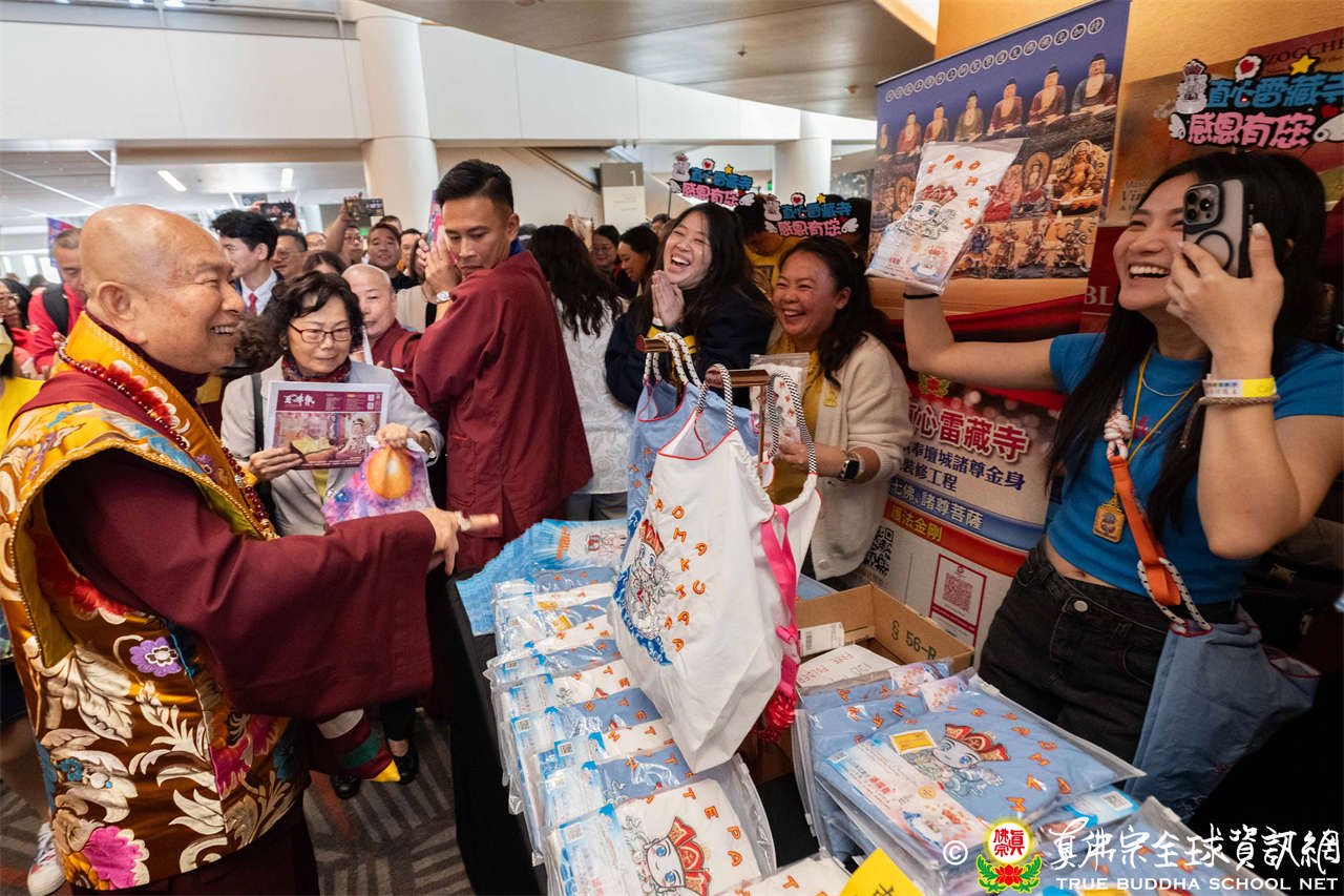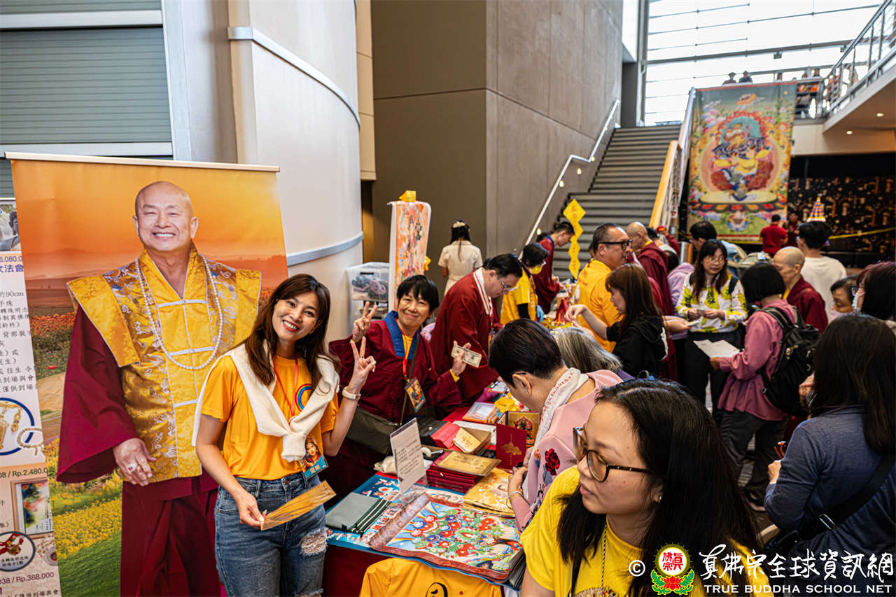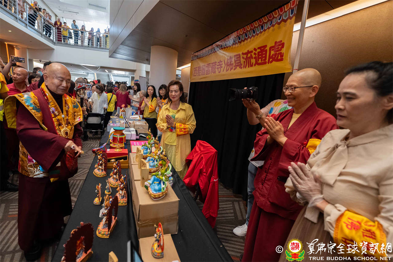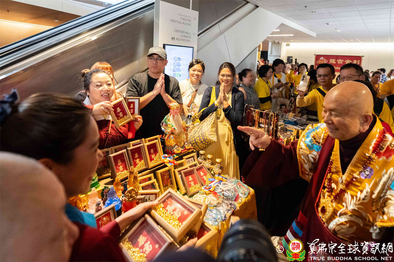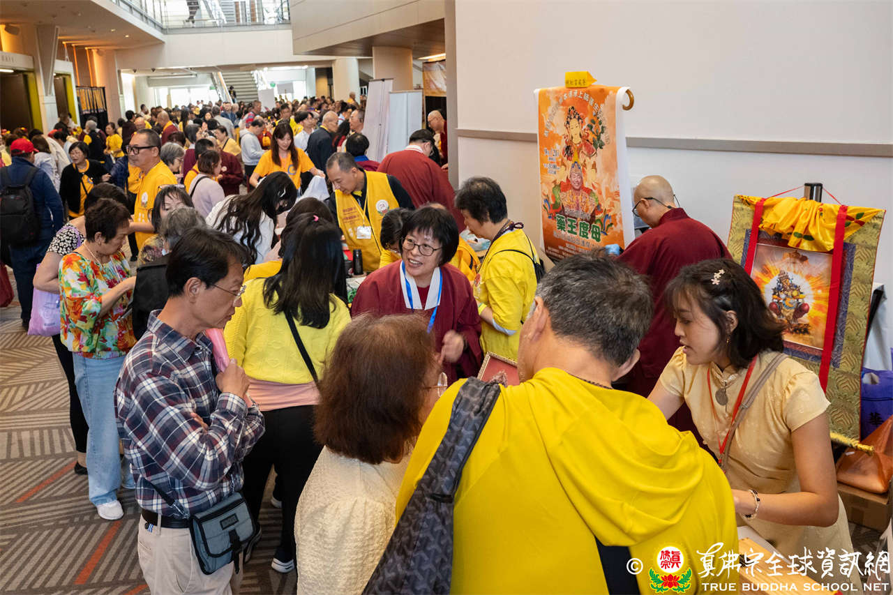 是日上午,自世界各地前來朝聖的弟子們歡喜相聚於會場,各攤位的佛具琳瑯滿目,吸引眾人圍觀選購,熱熱鬧鬧,人山人海,如同嘉年華會。