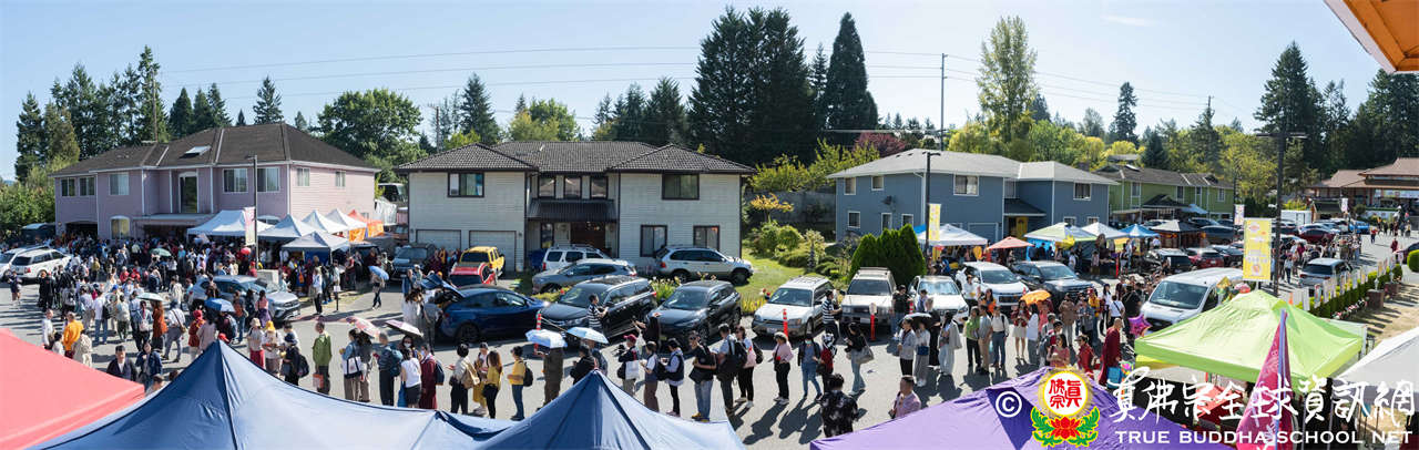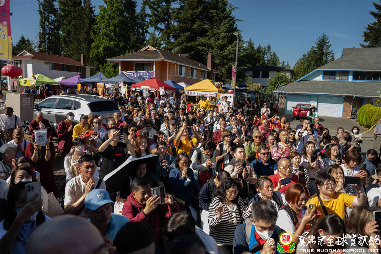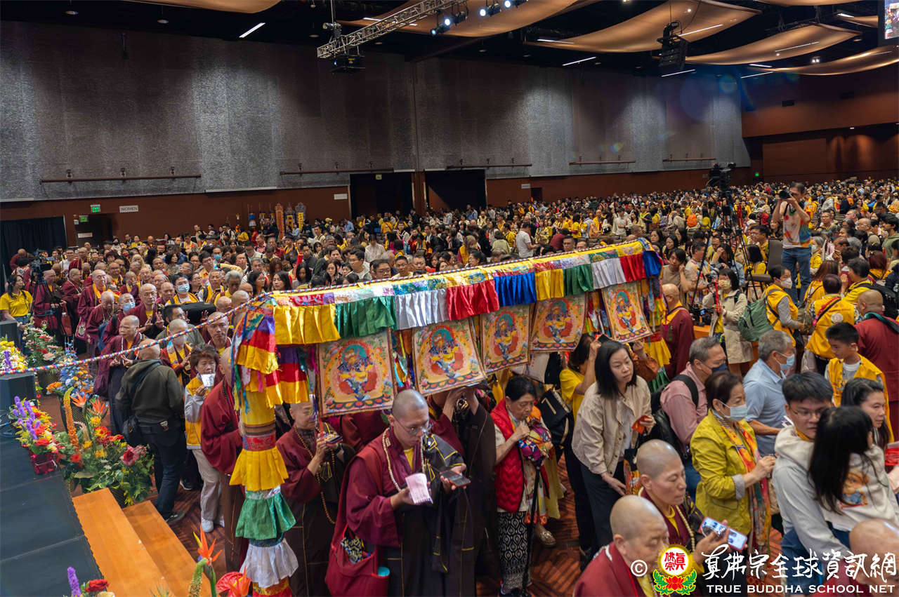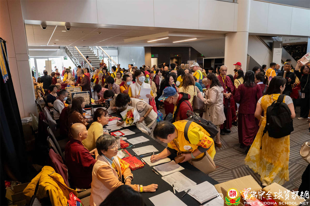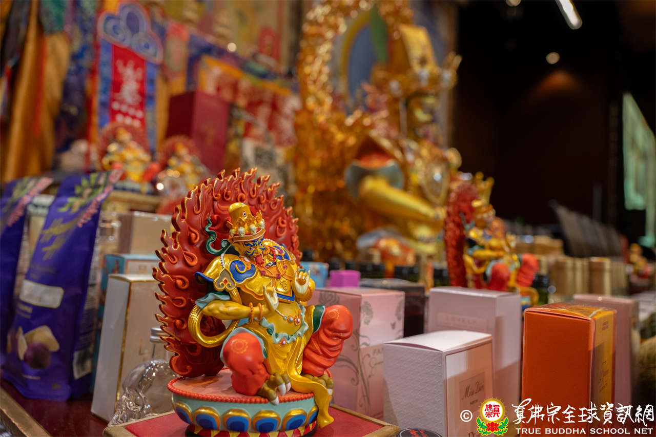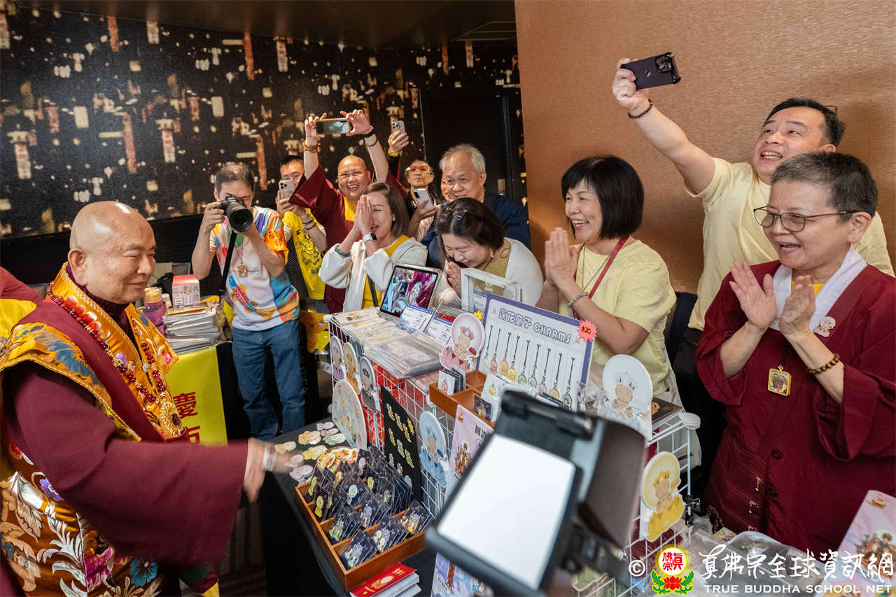 是日上午,自世界各地前來朝聖的弟子們歡喜相聚於會場,各攤位的佛具琳瑯滿目,吸引眾人圍觀選購,熱熱鬧鬧,人山人海,如同嘉年華會。
