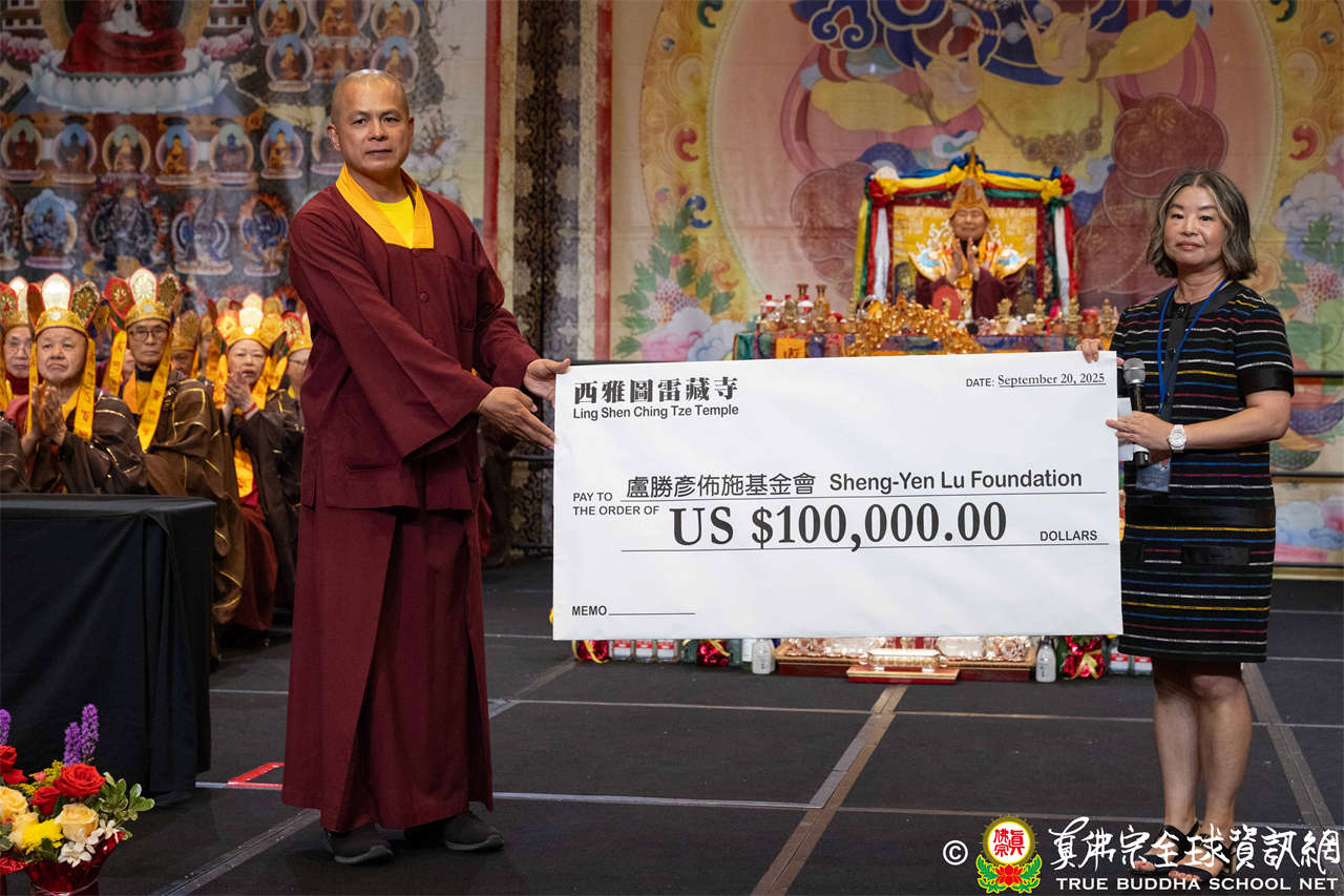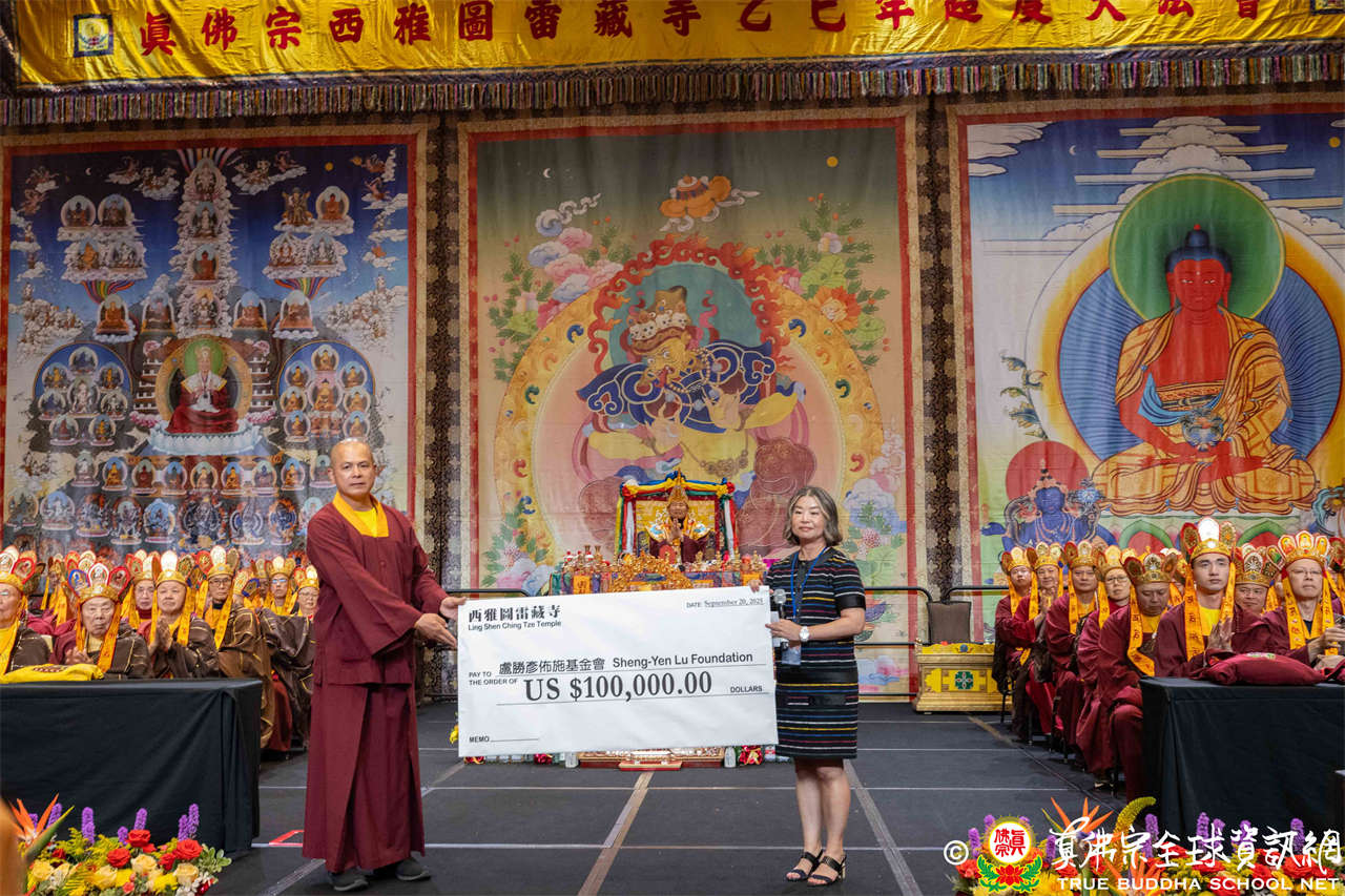 住持釋蓮吟上師代表西雅圖雷藏寺捐助10萬美元給盧勝彥佈施基金會,救濟貧苦眾生。