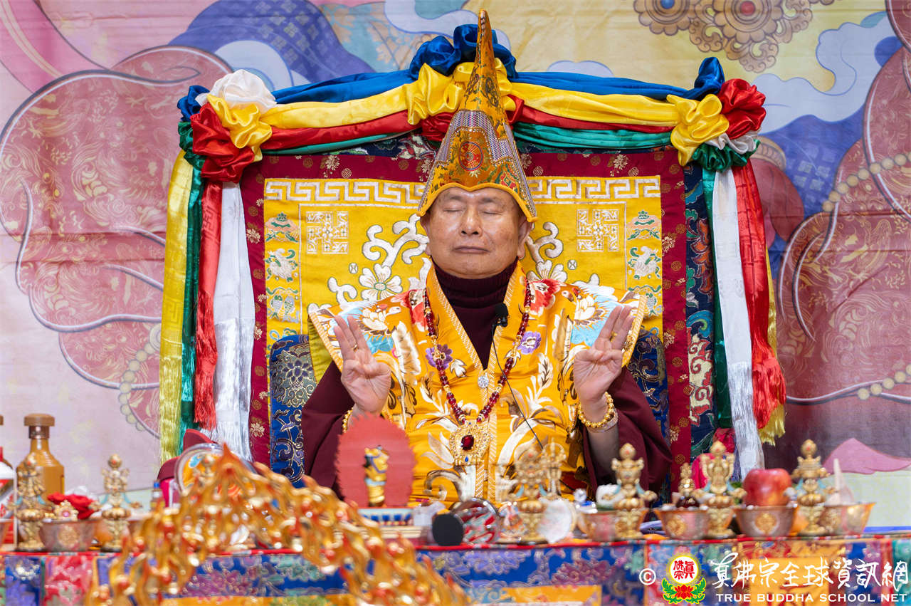 下午二時整,磬聲悠揚響起,四眾弟子虔誠合掌唱誦蓮花童子心咒,恭迎根本傳承上師聖尊蓮生活佛入壇場,眾等跟隨聖尊向佛菩薩與護法諸尊做大禮拜,法會正式揭開序幕。