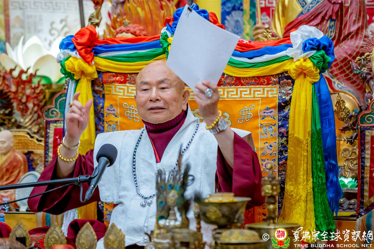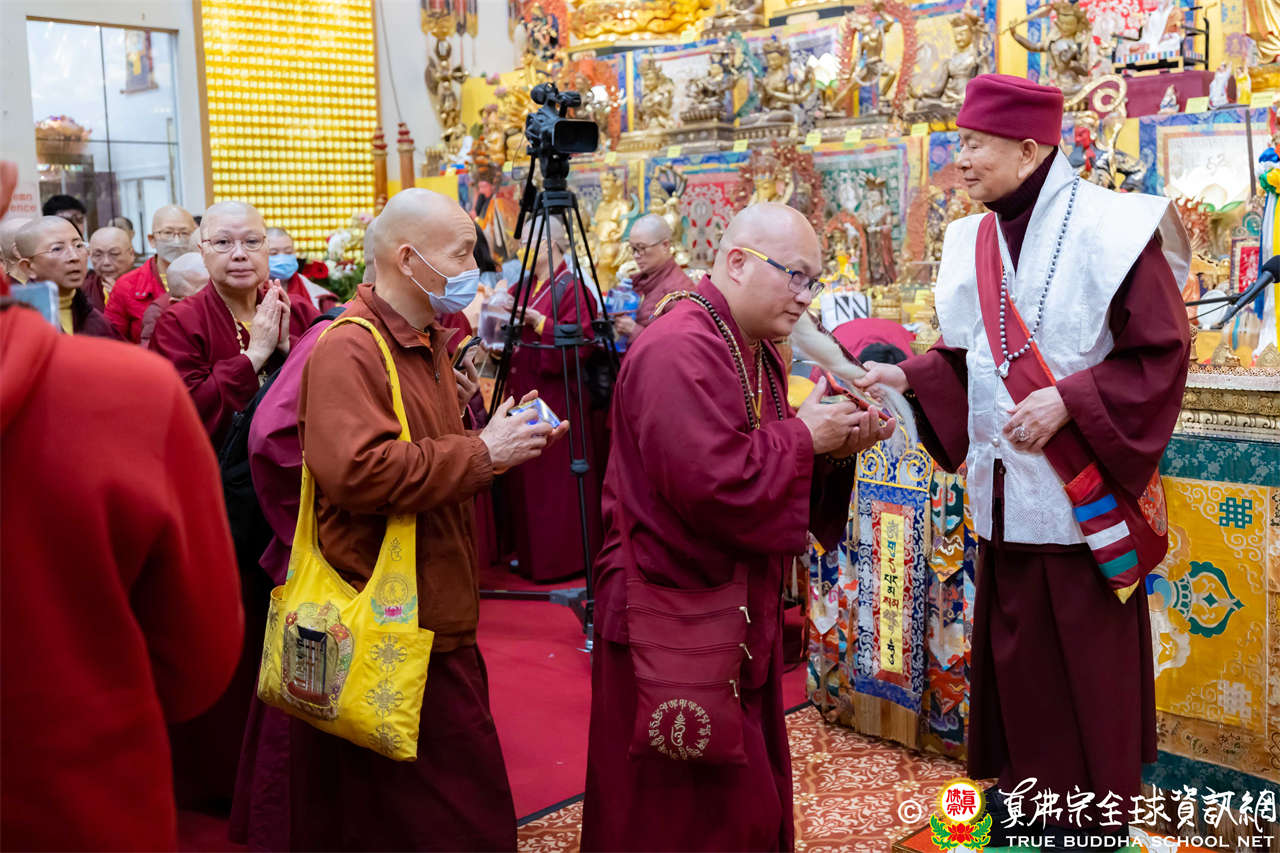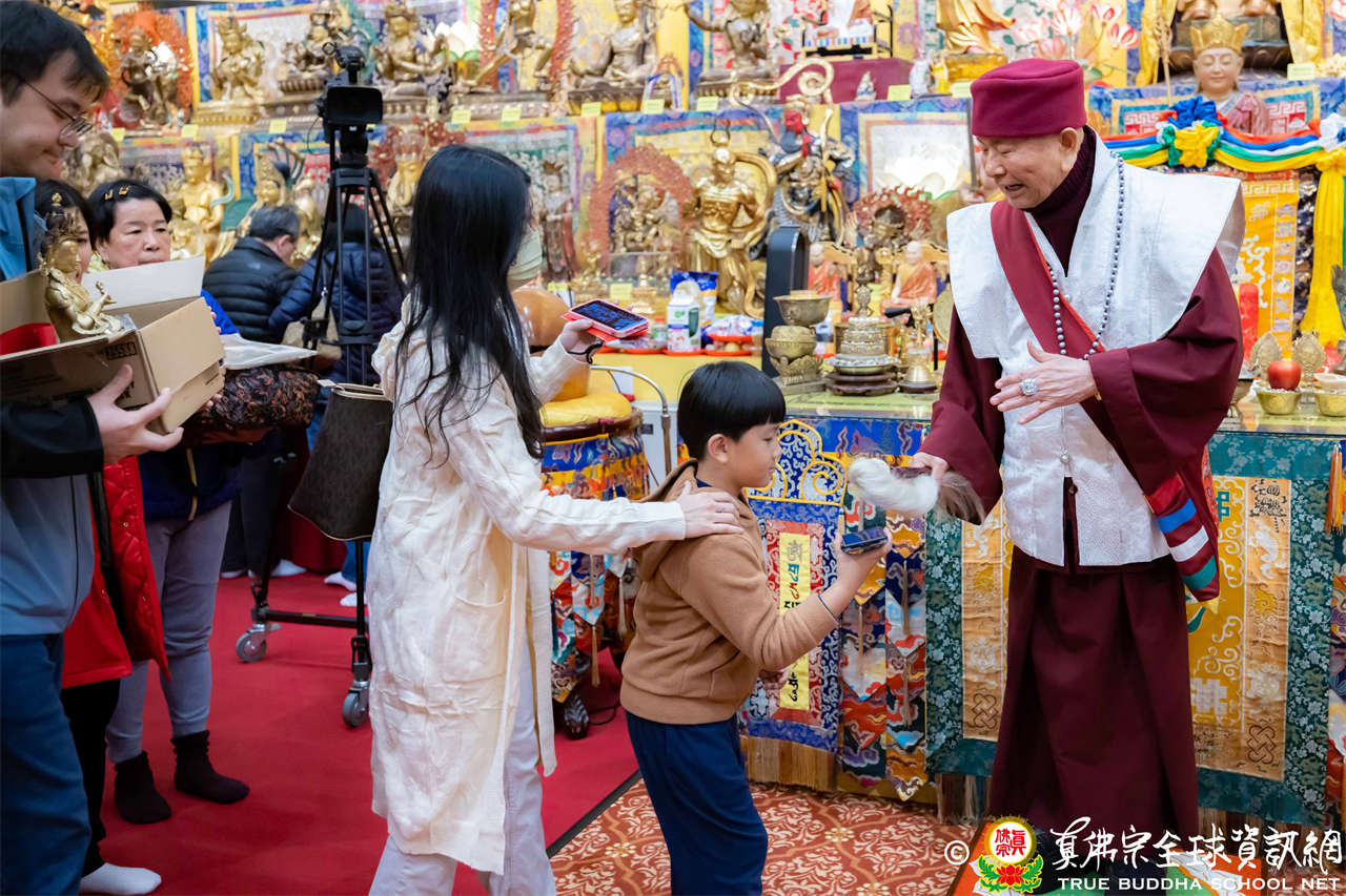 精彩的寶貴開示後,聖尊慈悲加持大悲咒水、開光佛像,並為新皈依弟子做皈依灌頂,然後手持拂塵,一一加持與會大眾。