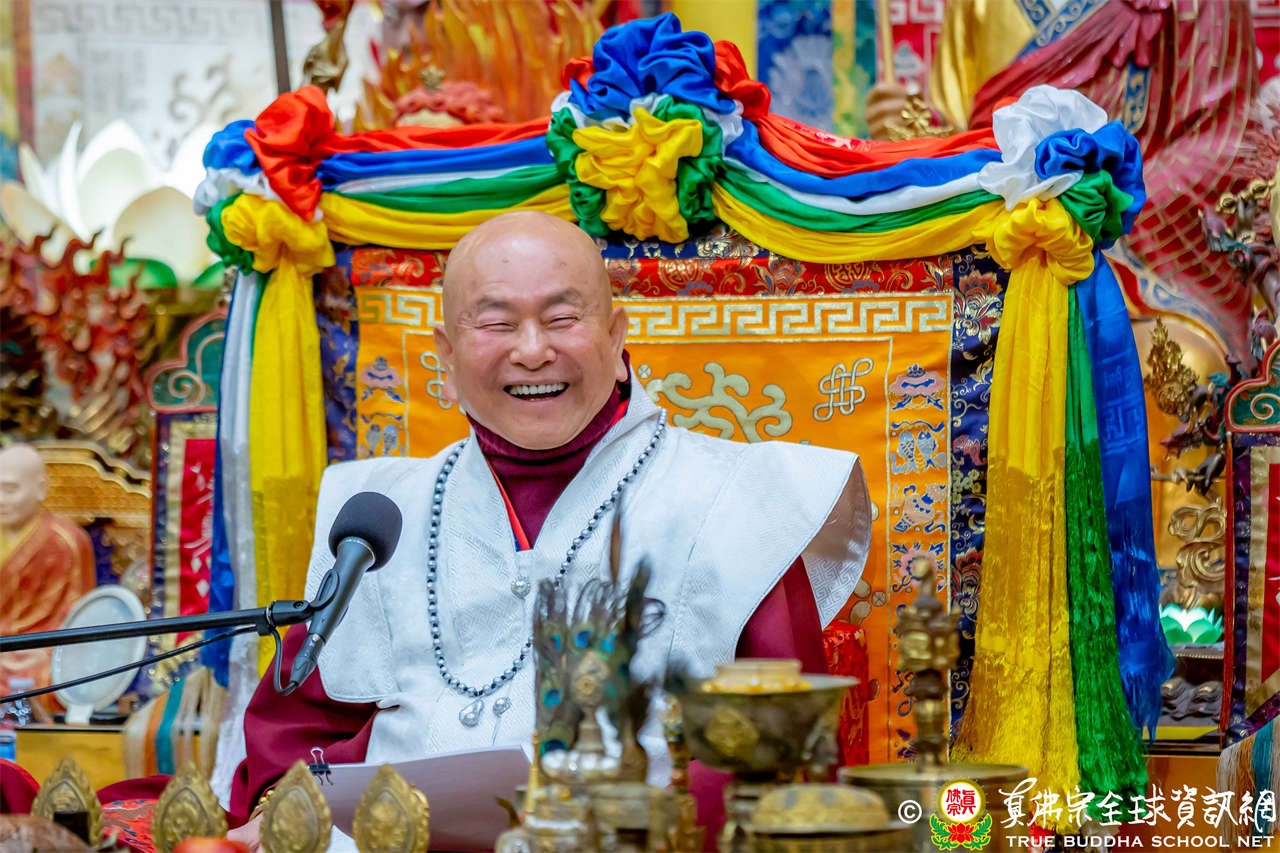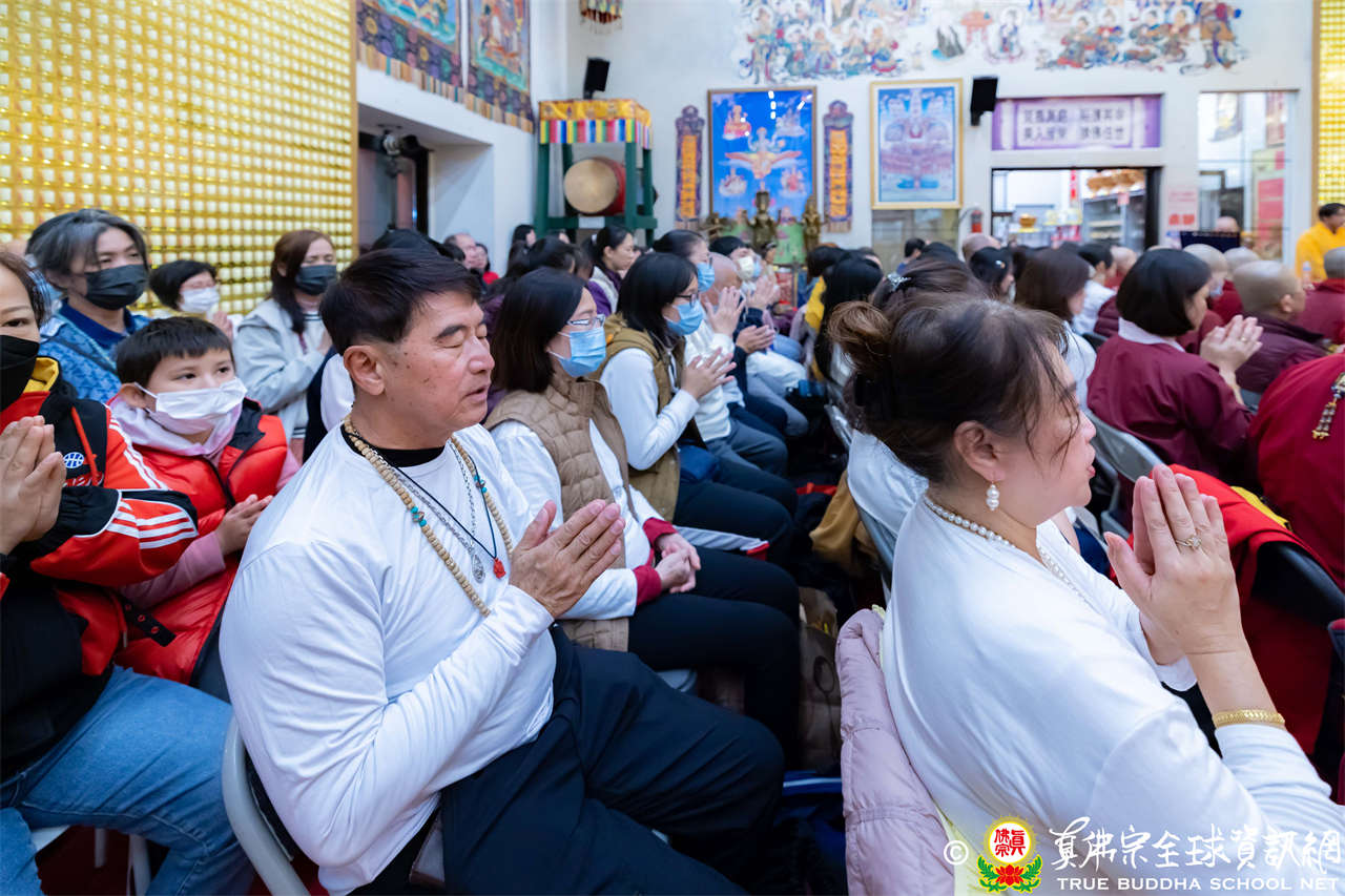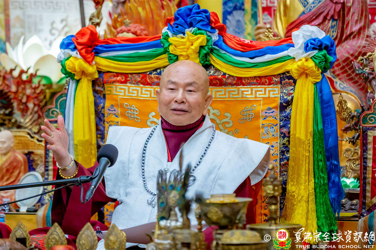 精彩的寶貴開示後,聖尊慈悲加持大悲咒水、開光佛像,並為新皈依弟子做皈依灌頂,然後手持拂塵,一一加持與會大眾。