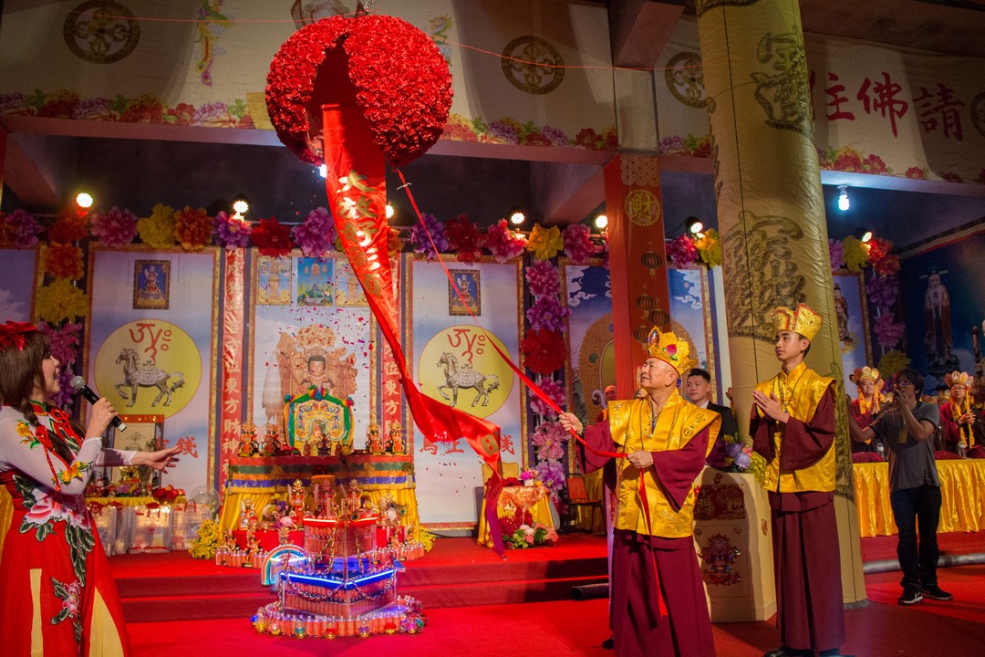 法王開示完畢,大眾抱以熱烈掌聲,感恩蓮生法王的寶貴開示。接著蓮生法王慈悲做總加持及打招財鼓,與師母蓮香上師、吐登悉地仁波切一同拉放新春彩球及敲響平安鑼,加持所有功德主接財神。最後賜授與會大眾「金面金母不共大法」灌頂,法會圓滿結束。