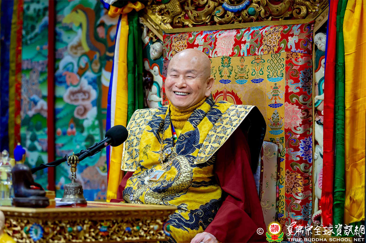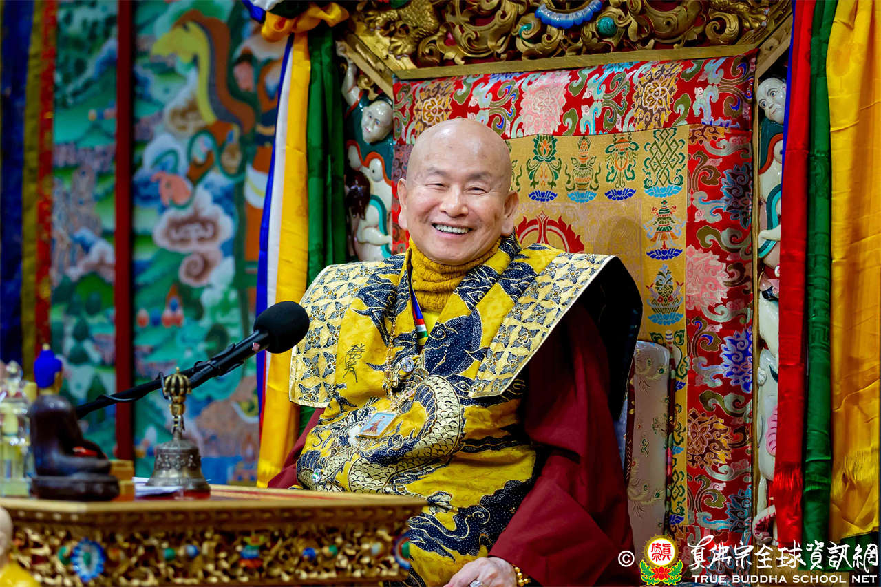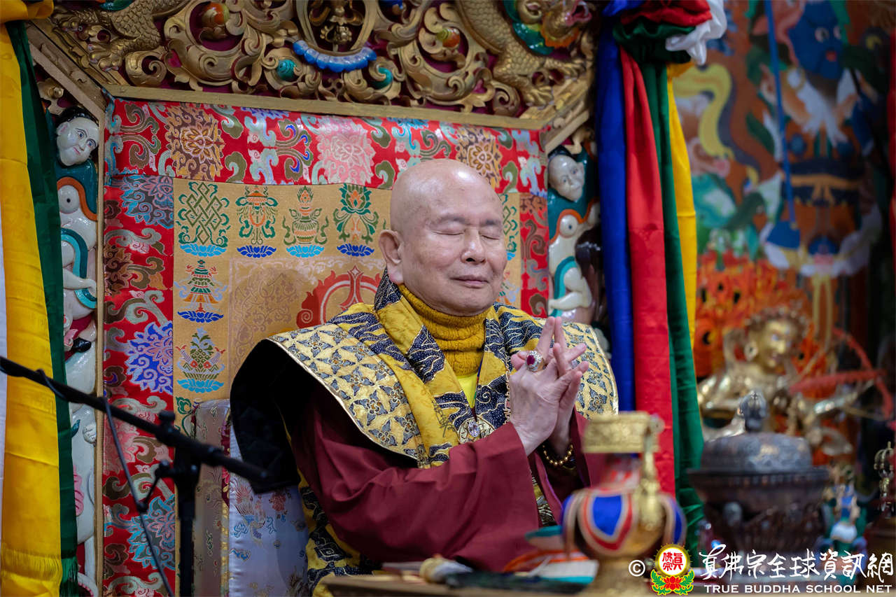 接著,法王繼續講解《大佛頂首楞嚴經》〈卷第四〉:「無上大悲清淨寶王,善開我心。能以如是種種因緣,方便提獎,引諸沈冥出於苦海。世尊。我今雖承如是法音,知如來藏妙覺明心遍十方界,含育如來十方國土,清淨寶嚴妙覺王剎。如來復責多聞無功,不逮修習。我今猶如旅泊之人,忽蒙天王賜與華屋,雖獲大宅,要因門入。惟願如來不捨大悲,示我在會諸蒙暗者,捐捨小乘,畢獲如來無餘涅槃本發心路。令有學者,從何攝伏疇昔攀緣,得陀羅尼,入佛知見。作是語已,五體投地。在會一心,佇佛慈旨。」