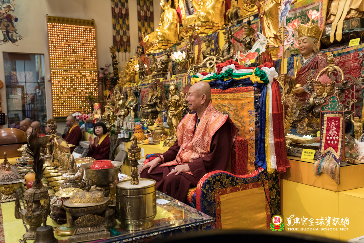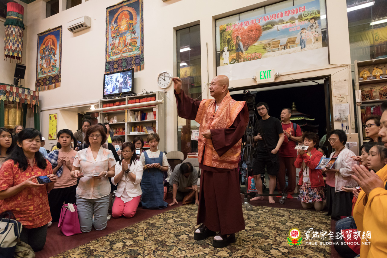 會後,聖尊為大眾賜授皈依灌頂、加持大悲咒水及開光佛像。離廟前,聖尊為與會善信一一摩頂加持。今晚聖尊的開示,身為弟子深刻感受到,對根本上師的恭敬和淨信俱足,是修行的首要根本,弟子們無論是白天黑夜,對於根本上師,都要能日間頂戴、夜裡住心。