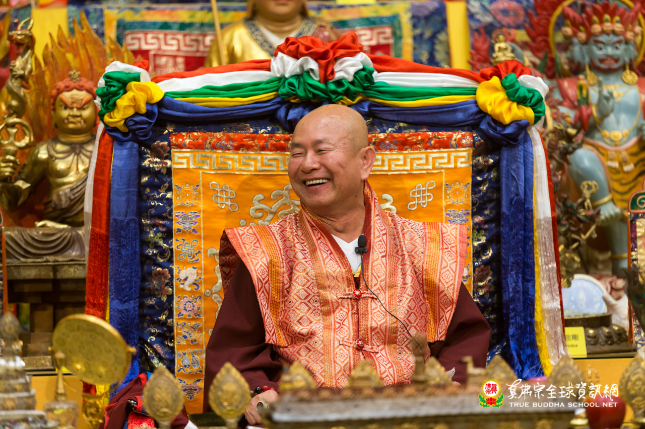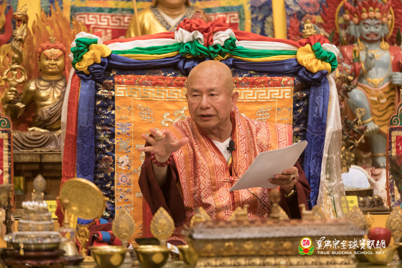 聖尊首先談到今晚的修法主尊蓮華生大士。祂說西藏密教的開始,是由蓮華生大士把密教帶到西藏,可以稱為藏地的第一位祖師爺。紅、黃、白、花四個教派,都非常恭敬蓮華生大士。祂與藏王赤松德真王、寂護大師,建立了西藏第一座寺廟桑耶寺。聖尊談到,蓮師手上所持的骷髏杖,上面有三個骷髏,正是代表著貪、嗔、癡,也就是佛教所說的三毒,這其中任何一種,都會讓人下到地獄的。為什麼蓮師所拿的卡杖嘎穿著三個骷髏?是表徵著祂已經把貪嗔癡全部都收掉了,沒有所謂的貪嗔癡。而世間沒有修行的人,沒有清淨的行為,一定會染上貪嗔癡的。聖尊認為一切的業大多來自於貪,除了真正的聖賢以外,都避不開權利、金錢跟色,這就是貪。嗔能夠變成戰爭,癡是包含所有一切的無明,而最大的愚痴就是認為人死了,什麼都沒有。因為佛教是講因果業報的。所以蓮師手上所拿的卡杖嘎,就是祂已經破除了貪嗔癡。在錢方面,聖尊談到自己一直謹守的一個戒律就是:盧師尊無論是弘法、皈依,絕對不會開口要錢。要當一個修行人,屬於自己的金錢可以擁有;不是屬於自己的金錢,就不能夠擁有。人是很愚痴的,我們追求人生的價值,追求清淨的生活,追求將來能往生佛國,甚至成為聖人,都要消除三毒貪嗔癡。