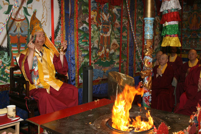 下午三時,法會由維那純熟的儀軌帶動下進行,在聖尊蓮生活佛點燃的護摩火中達到最高潮。大眾唸誦「嗡。金母悉地吽。」強而有力的咒音,立即迴盪在整個雷藏寺和法界。
