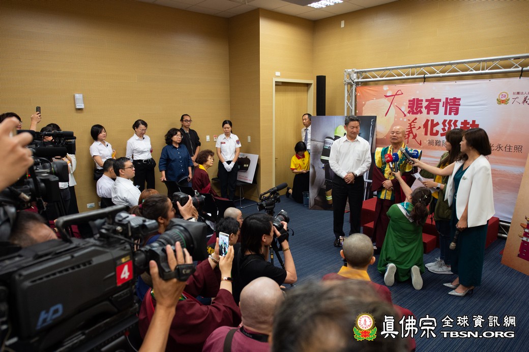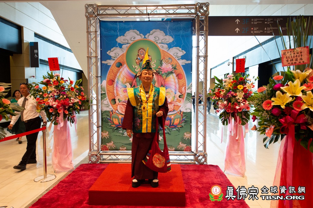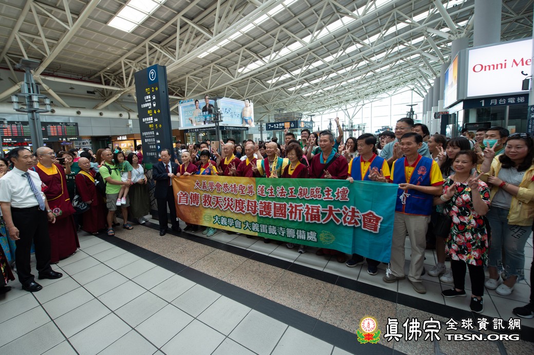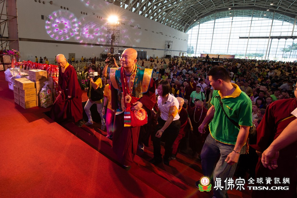 早在上午9點,四眾弟子便紛紛湧入會場。師尊、師母於10:50分抵達高雄展覽館,先加持了法會壇城、延生位、往生位及現場攤位,並持咒測試現場的音響設備;根本上師更自掏腰包,贊助了真佛般若藏和大義學會,如此實際的大賜福,令現場信眾無不感動。中午時分,功德主紛紛向師佛敬獻哈達,祈求救天災度母大悲心的加持,圓滿每一個善願。接著師尊接受了中天、民視等媒體的採訪;師佛講到自己與高雄的淵源,對此處有很深的眷戀,今日傳「救天災度母」法,就是要消除這片土地和台灣地、水、火、風的災難,真佛宗更熱心公益,「大義學會」為體恤打火兄弟的危險辛勞,特捐贈總價約台幣50萬的RIT(快速救援小組)救援包7組給高雄市政府消防局,黃江祥局長也回贈感謝狀,眾人皆期許「大義雷藏寺」速在高雄市矗立;記者們也問及現任高雄市長韓國瑜和蓮生法王的因緣,原來去年4月8日在高雄國際會議中心的「綠度母」傳法大法會,當時尚未成為市長候選人的國民黨高雄市黨部主委韓國瑜,就在法會上向蓮生活佛敬獻哈達,師尊感應到綠度母、二十一度母和咕嚕咕咧佛母給了他很大的加持,韓國瑜亦是相當努力與親民,能體恤百姓疾苦,自然俱足當選的善緣。