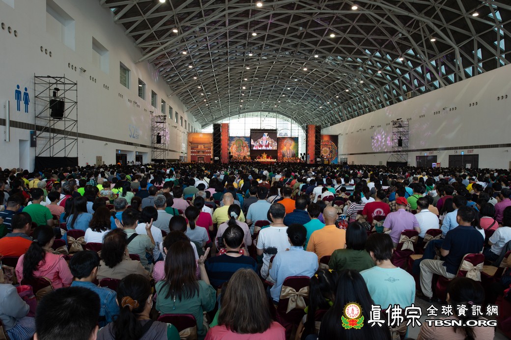 下午兩點,迎師組與上師團恭迎根本上師蓮生法王高昇法王座,主壇「救天災度母傳法大法會」。現場逾萬名善信與各界名流齊聚,將高雄展覽館偌大的會場擠得水洩不通。法會開始前,多位貴賓上台致詞;高雄市長韓國瑜偕同幕僚蒞臨,韓市長並上台致詞,他從事政治活動,絕不能忽略黎民百姓所遇的艱難,要時時保持一顆謙虛的心,有感於「世間苦人多」,感恩師尊主持這場佛教盛會,讓世人無比浮動的心能寧靜下來,遠離顛倒夢想,讓台灣社會和高雄,更和諧及美好。「高雄小金剛」許智傑立委講到和師尊結緣五六年,學到了歡喜做和歡喜心,便能一輩子快樂幸福。黃昭順立委也感謝師佛的基金會協助全球災後重建,八八風災後,更在高雄建橋、協助弱勢兒童,並讚嘆這場盛大的「救天災度母護國祈福大法會」,能讓台灣、高雄遠離災厄,風調雨順、國泰民安。