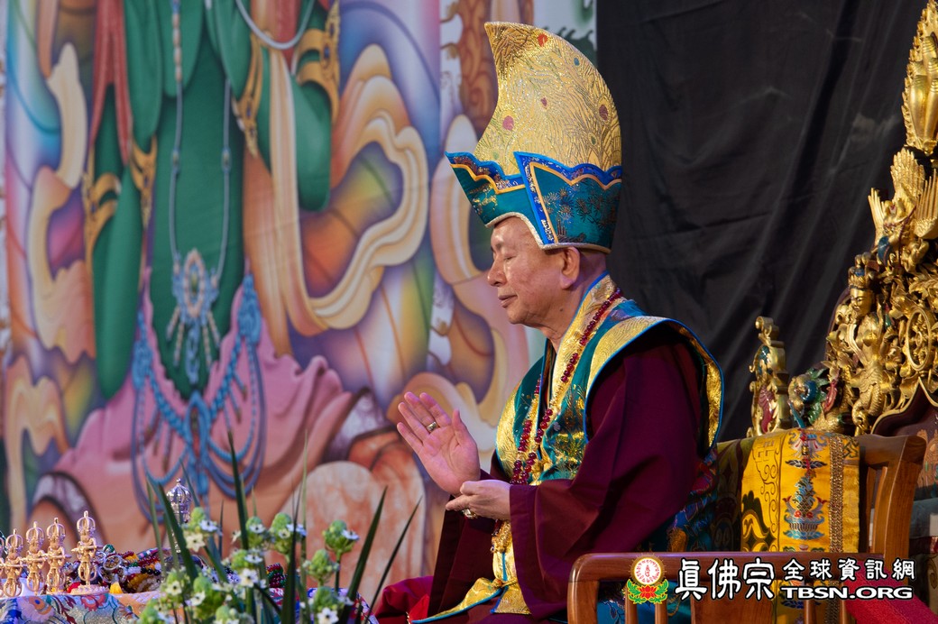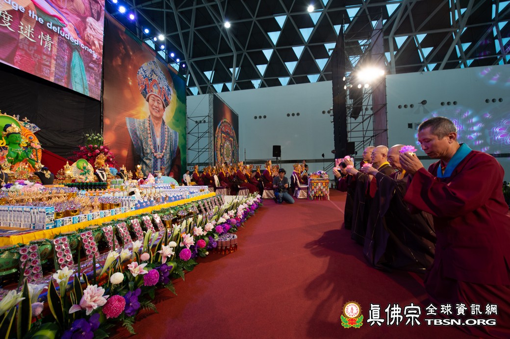 「救天災度母大法會」正式開始。會場銀幕播放著精緻的救天災度母三段法生觀想畫面,讓人人自然而然地在念頭中升起莊嚴法相,救天災度母心咒:「嗡。達咧。都達咧。都咧。媽媽沙爾哇。耶耶嘛哈。哈那巴雅。新登木。咕嚕。梭哈。」的優美咒音中,根本上師演化息災、增益、祈福、敬愛、超度大手印,清淨的法流灌頂著每位與會者!迴向時,蓮生法王祈請救天災度母接引幽冥眾往生佛國;消除大眾的業障、疾病、災難、煩惱和意外,人人福慧增長、敬愛圓滿、所求如願、修行得力、光明熾盛、心靈提升、果位增上;護佑這一片大地吉祥如意!