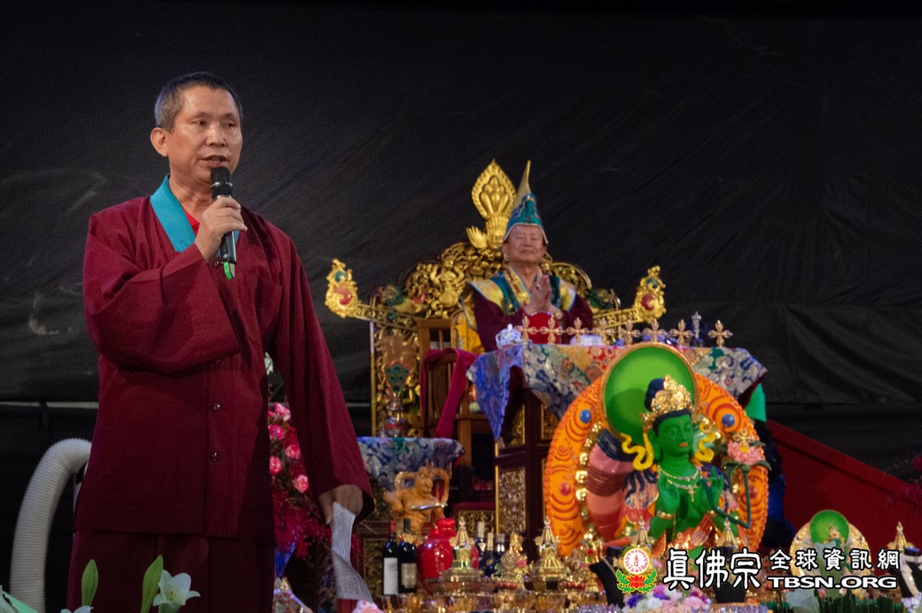 開示時,師尊感謝每一位來賓的蒞臨支持。今日救天災度母、綠度母、二十一度母、般若佛母及以下所有佛母、空行母悉皆下降,令本場法會靈氣充滿!「救天災度母」法有弭平世間地、水、火、風等天災的大威力,而救災各有口訣;想壓制一塊土地的地震,要在此處東、西、南、北四方和中央各取一公斤砂土,在壇城修「救天災度母法」108壇做加持,修完法將五方土各還於五方,取一公斤土,還一公斤土,如此該處將不再地震。而「兵來將擋,水來土掩」要救水災,可取河邊的土回壇城修法,後將土灑回,該河便不再氾濫。要救「火災」,則在房子著火時,行者修九字真言法,唸:「臨兵鬥者皆陣列在前」,結「四縱五橫印」壓向火勢,火就不再延燒,消防車也會很快趕至。至於「風災」,尊勝佛母塔、尊勝佛母咒和救天災度母咒,都能鎮颱風;在一塊土地建尊勝佛母塔,颱風即轉向。如颱風盛行的關島,一設立尊勝塔,颱風便不再登陸。上述法門極其珍貴,未受灌頂的上師、弘法人員和同門皆不可修!