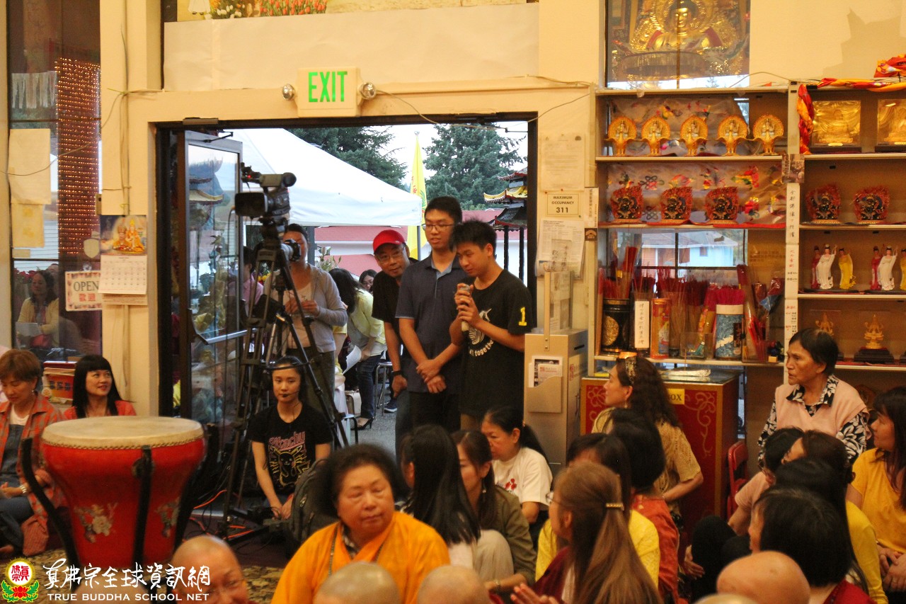 在師尊結束精彩法語開示後,為多位信衆賜授皈依灌頂,並加持大悲咒水及開光佛像。西雅圖雷藏寺準備了金母生日大蛋糕,師尊師母與大衆合唱生日歌,然後師尊慈悲ㄧㄧ為每位善信摩頂,大衆也分得壽桃、壽包、滿載而歸,個個都法喜充滿。非常感恩聖尊的諄諄教誨,讓大家受益良多,感恩師尊!