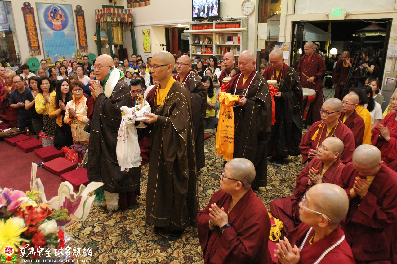 在大衆虔誠的恭誦瑤池金母普度收圓定慧解脱經後,接着就是恭請根本上師聖尊蓮生活佛於己亥年秋季大法會首傳密勒日巴尊者本尊法的請法儀式。在莊嚴的擊鼓聲中,由西雅圖雷藏寺常住釋蓮旺上師代表敬獻傳法主尊「密勒日巴尊者」金身。「以此密勒日巴法像尊,叩請蓮生聖尊傳大法,千載難逢殊勝法,三昧甘露利無窮,祈願密勒日巴尊者垂加䕶,了達我等內氣脈相,拙火熾燃光明樂。」再由釋蓮旺上師代表敬獻哈達,以表對根本傳承上師最高崇高之敬意。請法儀式吉祥圓滿。