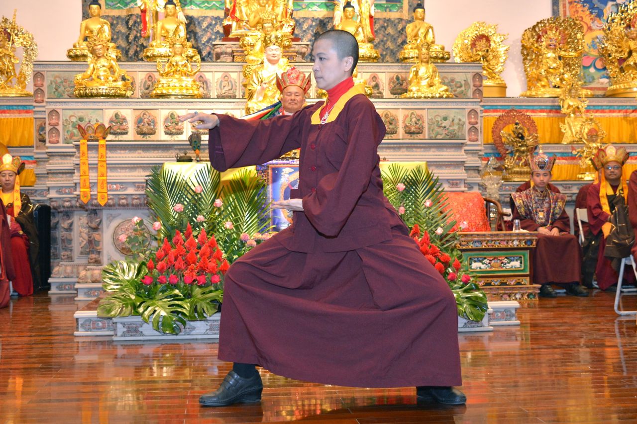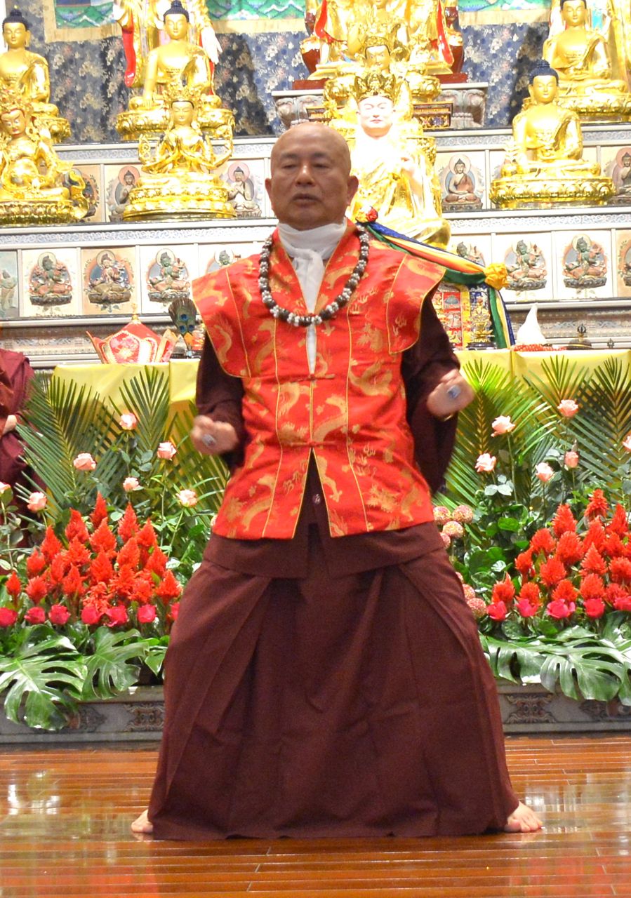 接著,在大家一陣熱烈掌聲中,蓮生活佛特別示範「十字拳」(男生的「金剛亥母拙火拳」;而蓮店上師示範的是屬於女生的「金剛亥母拙火拳」)
