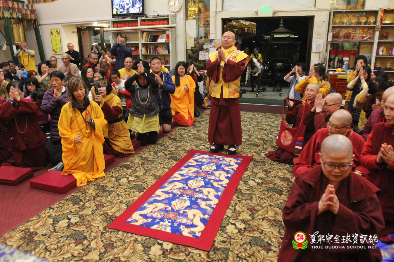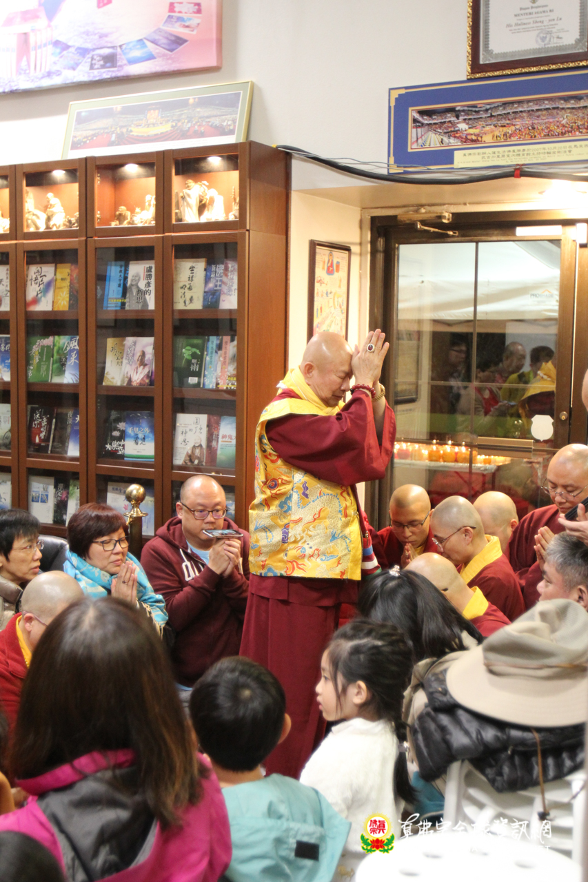 開示結束後,聖尊為大眾賜授皈依灌頂、加持大悲咒水和開光佛像。離開祖廟前,聖尊慈悲為大眾摩頂加持。聖尊是晚的開示,法音繞樑、法味縈繞,所有弟子們至誠感謝聖尊的教導,讓大家能明白無所得、無所失、無所畏懼的自在清明。