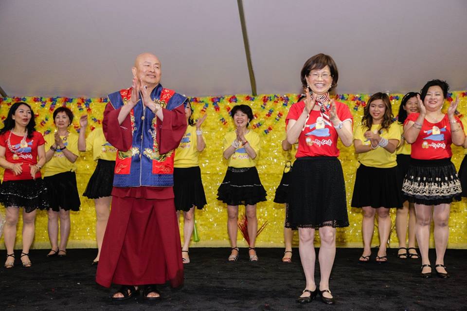 青春美麗的師母帶領數十位「真佛陽光舞供團」演出精釆的排舞,贏得滿堂喝釆;師母還特別請師尊上台與大家一起共舞運動,台下同門也一起舞動身體,大家開心不已,掌聲連連。