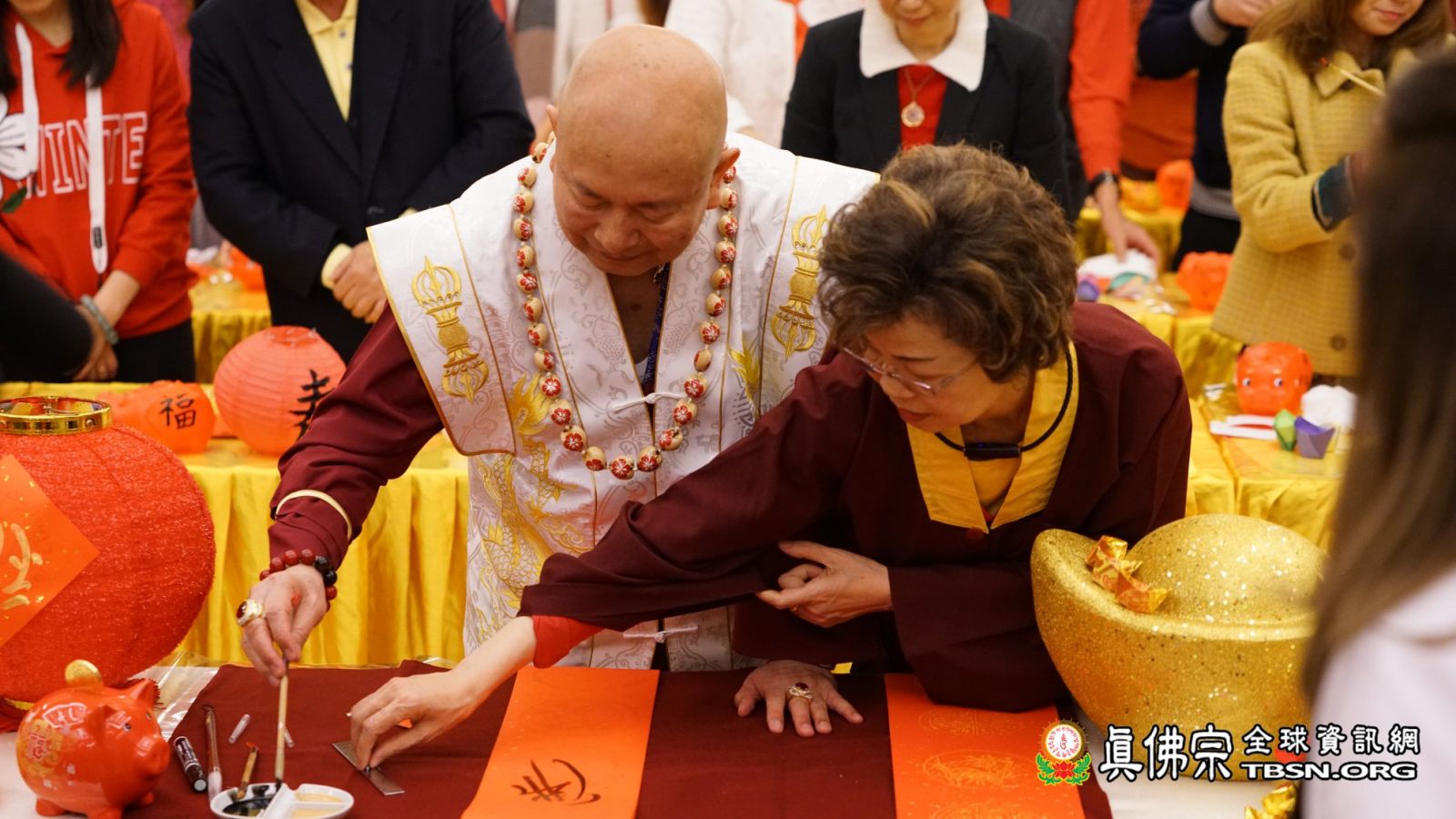 十一時許,法王蓮生活佛和師母蓮香金剛上師抵達台灣雷藏寺;弟子們見到了久違的師母,且精神飽滿地和師尊進行新春活動,諸弟子無不為她感到歡喜。師尊、師母先和大眾一起摺金元寶,願「金豬報喜!豬年吉祥!」而依師尊之前的開示,今年「接財神」要準備紅豬撲滿,主辦單位也準備了許多紅豬,及喜氣的紅燈籠讓大家題字;師佛先題了「滿」,象徵大眾「富貴滿滿,錢包滿滿」,再把「福」字倒貼在紅燈籠上,表示「福到了」!師母則在紅豬上題了個「祥」字,在紅燈籠上題了「吉」,呼應新年的「吉祥如意」!師尊和師母也跟大家一齊捧著紅豬和紅燈籠,喊道:「迎金豬,招財運,平安健康一整年!」令初一的台灣雷藏寺更顯得喜氣洋洋。