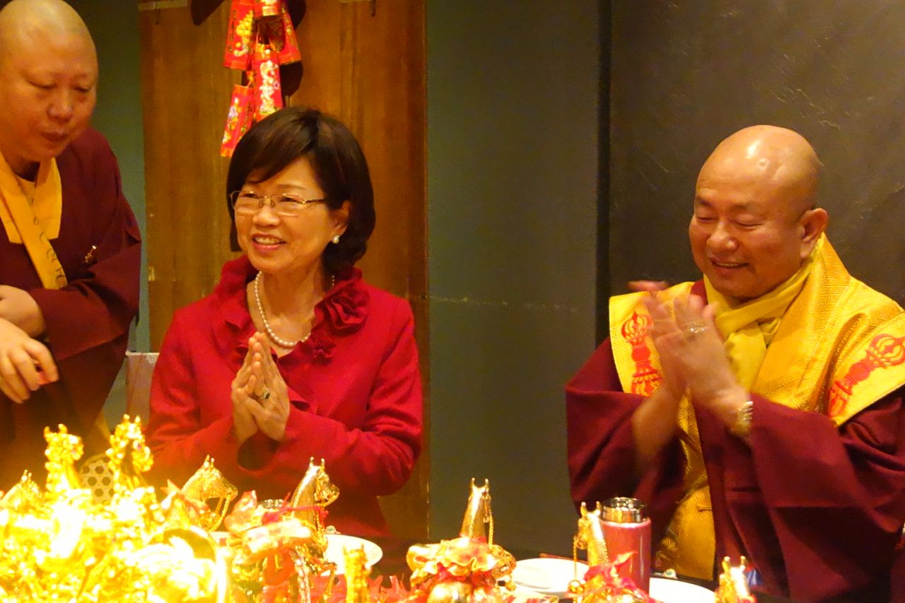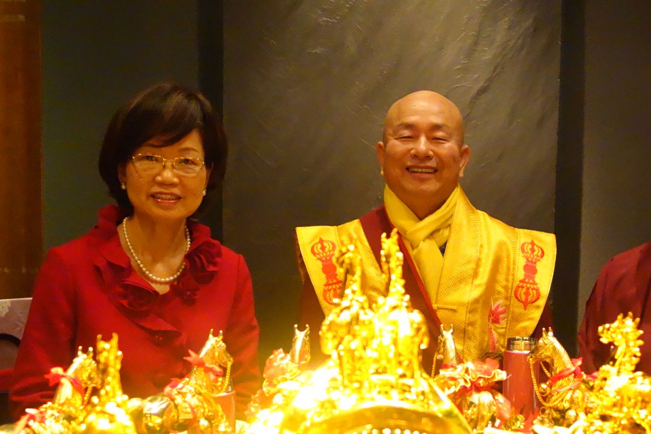 當師尊一進門看到整個房間「金光普照」,馬上就說:哇!馬上有錢,馬上發。師母又再加一句:馬上鑽(賺)!這時,眾弟子「馬上掌聲如雷」,感謝師尊、師母慈悲賜福大加持。蓮馨上師將桌上象徵金馬年「富貴長壽」的「寶馬」供養尊貴的師尊、師母,以及供養師尊龍袍、法王冠之外,也供養在座每一位參加的上師、法師、講師、及隨行同門每人一匹「寶馬」,讓大家同霑佛光,人人「馬上得大福」!