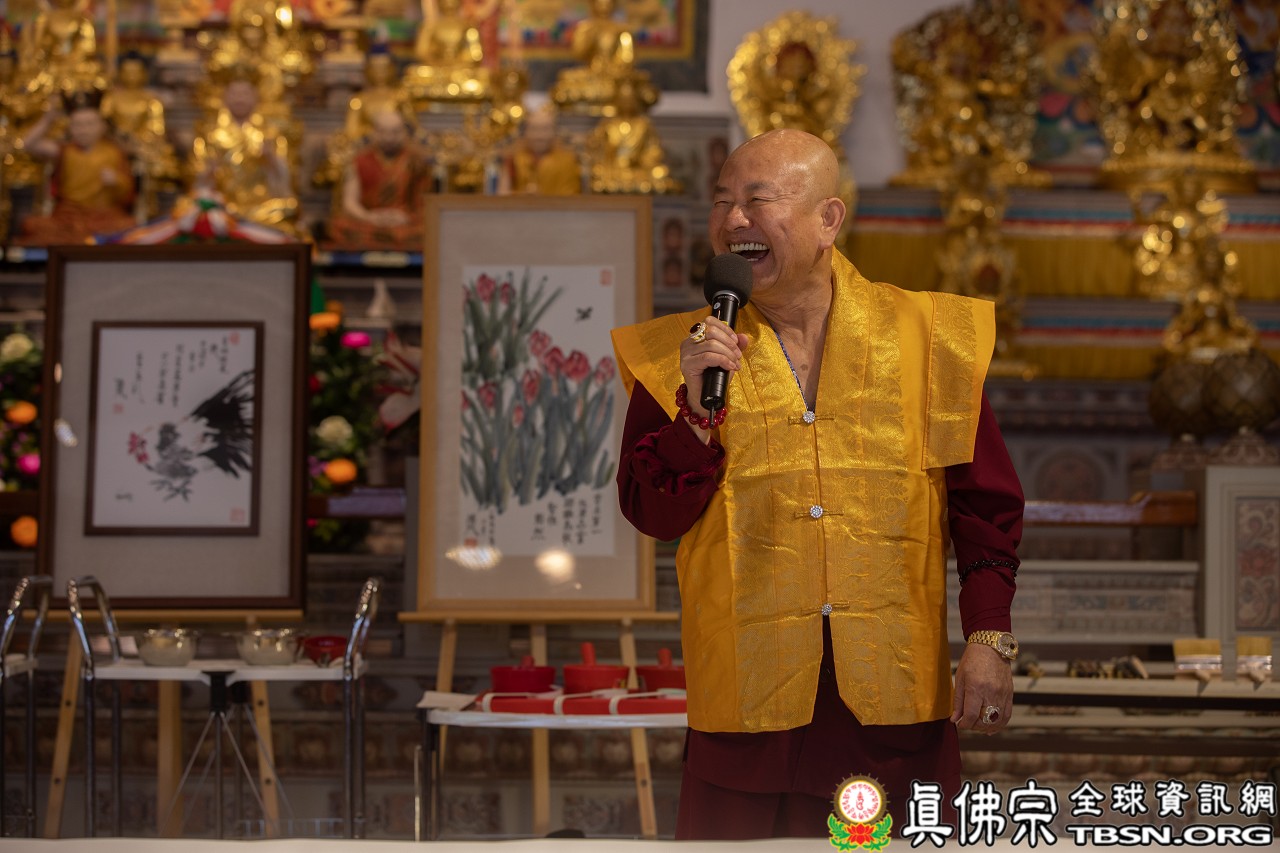 此次法王作家創作有別於前,首次嚐試以壓克力顏料方式揮灑彩墨,主辦單位大燈文化現場搭配鋼琴、古箏音樂演奏及天女獻舞,使會場充滿文藝氣息,同時穿插江南四大才子劇情演出,幽默逗趣。與會信眾盡情觀賞法王神來之筆,自然天成。