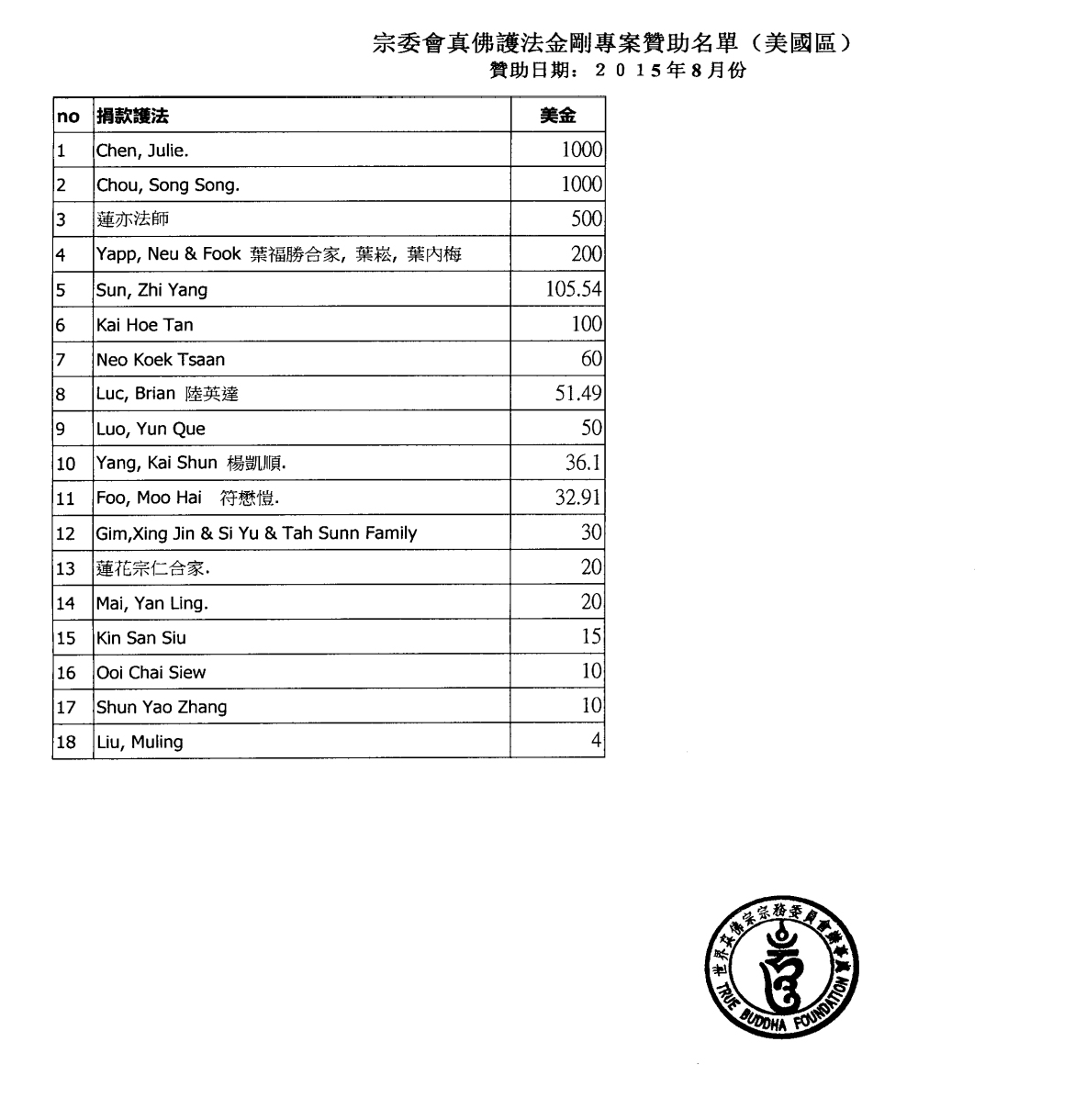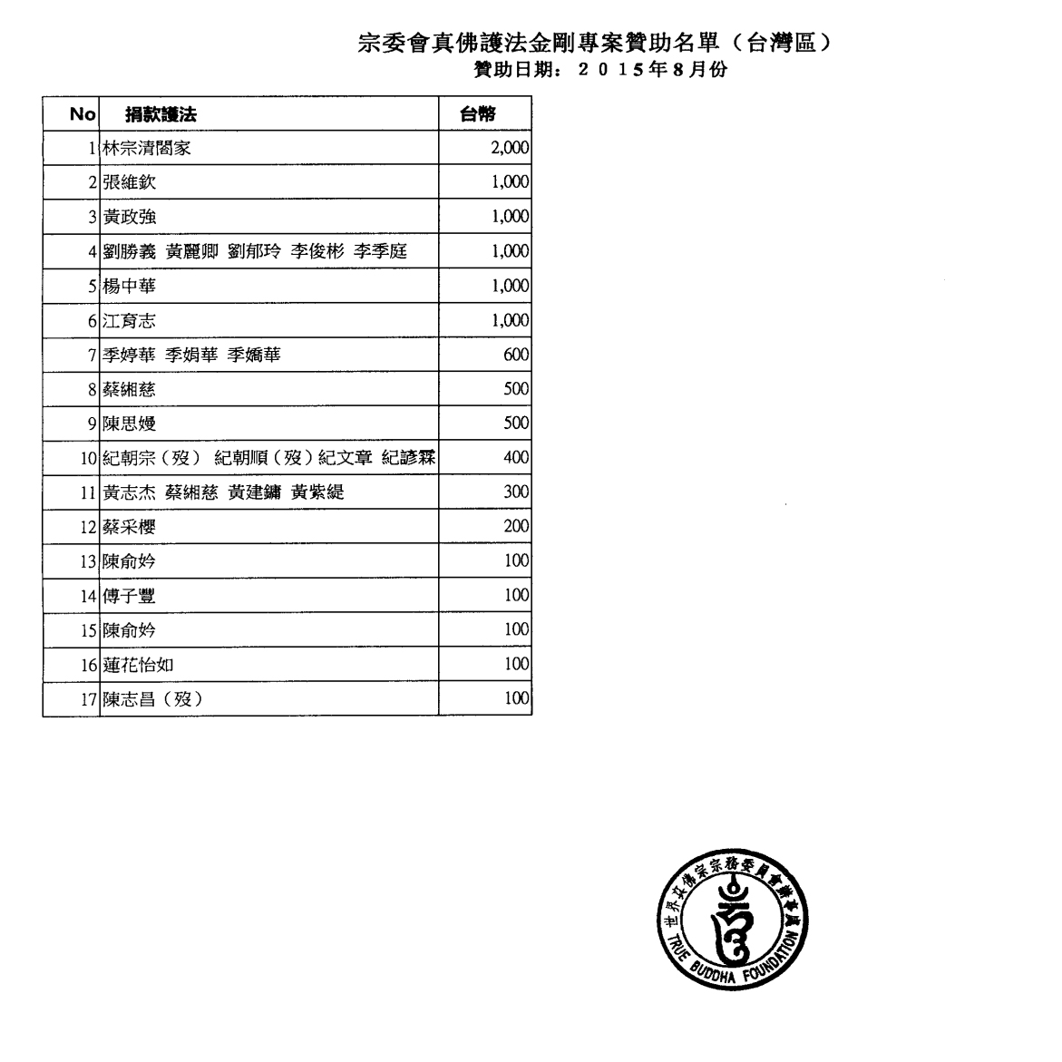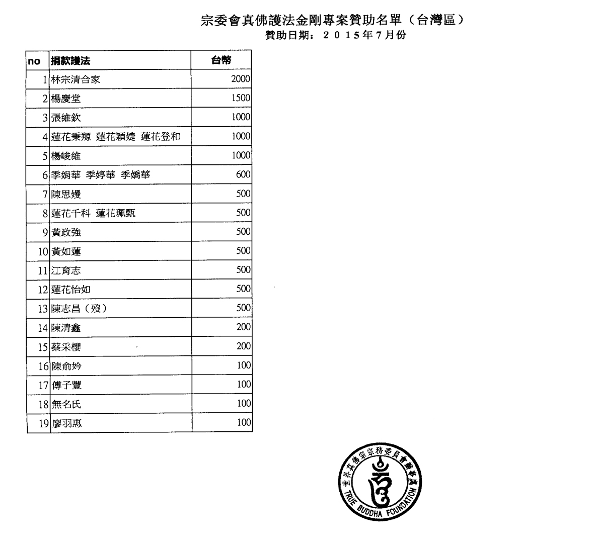 【宗委會通告】感恩 蓮生活佛 盧勝彥法王慈悲加持2015.7.1 ~8.31【真佛護法金剛榜】贊助者名單