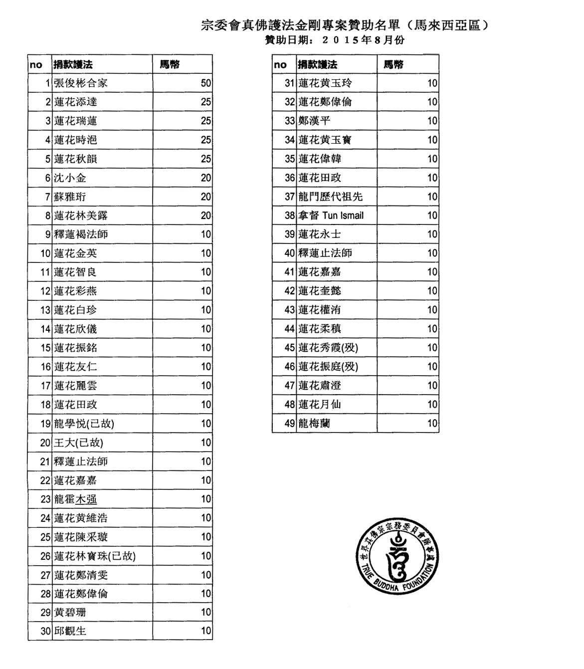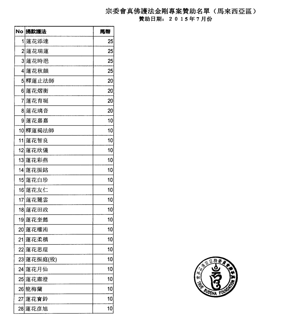 聖尊蓮生活佛 盧勝彥法王慈悲加持2015.7.1 ~8.31【真佛護法金剛榜】贊助者名單【真佛護法金剛榜】贊助者名單,所有名單已恭請師尊加持。