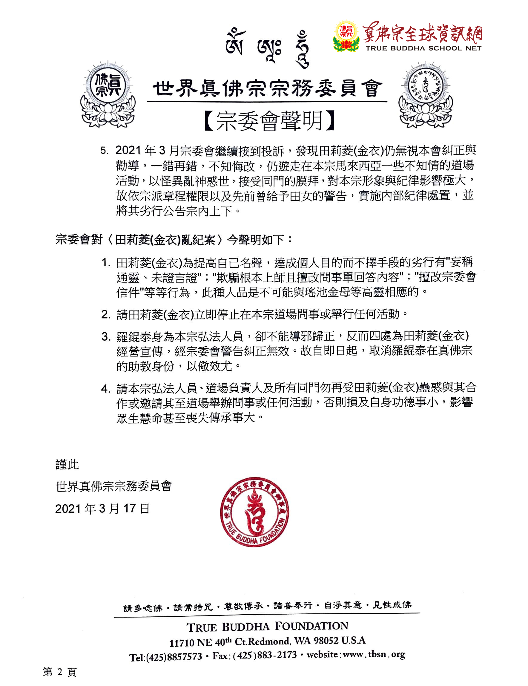 2021年3月宗委會繼續接到投訴,發現田莉菱(金衣)仍無視本會糾正與勸導,一錯再錯,不知悔改,仍遊走在本宗馬來西亞一些不知情的道場活動,以怪異亂神惑世,接受同門的膜拜,對本宗形象與紀律影響極大,故依宗派章程權限以及先前曾給予田女的警告,實施內部紀律處置,並將其劣行公告宗內上下。