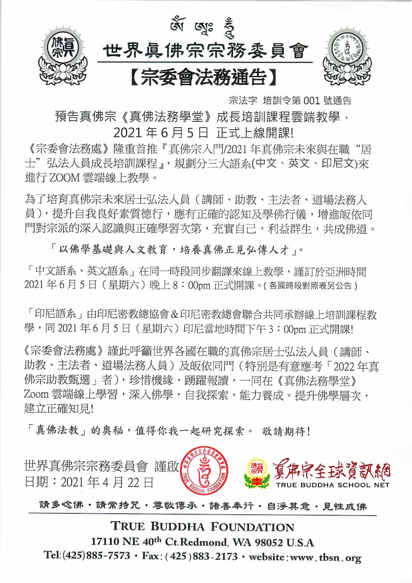 《宗委會法務處》隆重首推『真佛宗入門/2021年真佛宗未來與在職“居士”弘法人員成長培訓課程』,規劃分三大語系(中文、英文、印尼文)來進行ZOOM雲端線上教學。