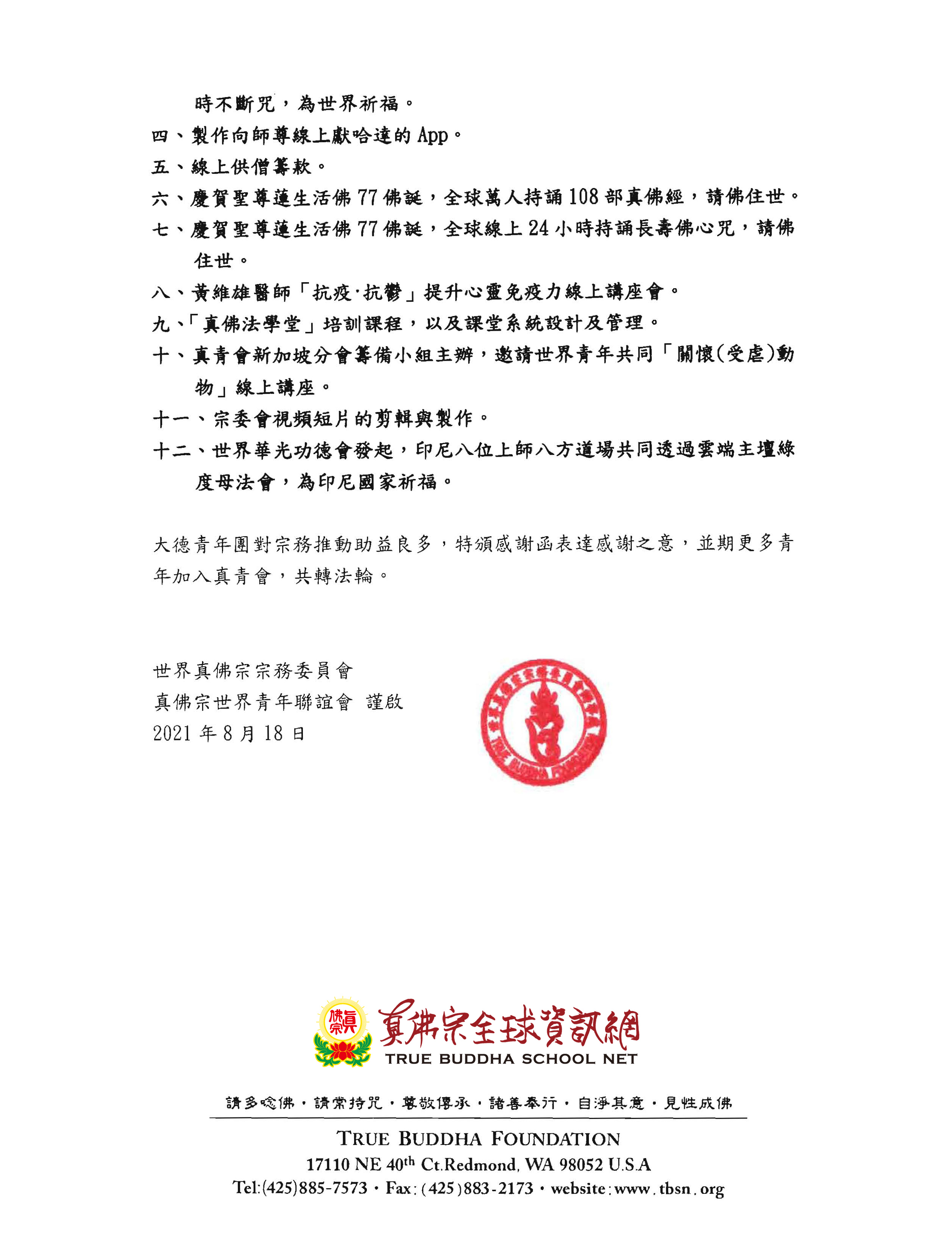 世界真佛宗宗務委員(宗委會)暨真佛宗世界青年聯誼會(真青會)茲感謝馬來西亞密教總會大德青年團,自2020年開始,全球受到Covid-19新冠疫情肆虐之際,鼎力協助宗委會舉辦各項的線上活動,促使全球各地真佛弟子透過雲端,保持聯繫、學習及成長,2020年8月~2021年8月具體項目如下: