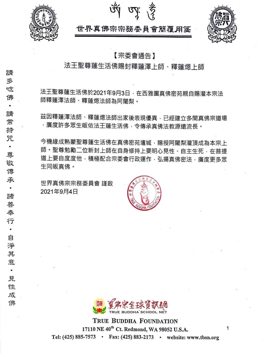 法王聖尊蓮生活佛於2021年9月3日,在西雅圖真佛密苑親自賜灌本宗法師釋蓮澤法師、釋蓮煾法師為阿闍梨。