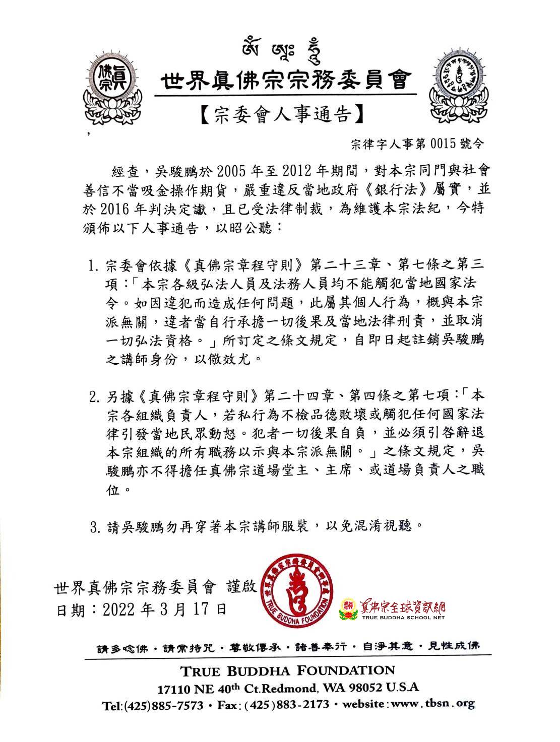 1. 宗委會依據《真佛宗章程守則》第二十三章、第七條之第三項:「本宗各級弘法人員及法務人員均不能觸犯當地國家法令。如因違犯而造成任何問題,此屬其個人行為,概與本宗派無關,違者當自行承擔一切後果及當地法律刑責,並取消一切弘法資格。」所訂定之條文規定,自即日起註銷吳駿鵬之講師身份,以儆效尤。