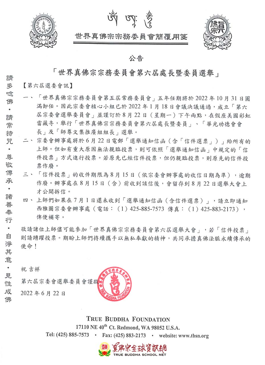 敬請諸位上師儘可能參加「世界真佛宗宗務委員會第六屆選舉大會」,若「信件投票」則請踴躍投票。期盼上師們持續攜手以無私奉獻的精神,共同承擔真佛法脈永續傳承的使命!